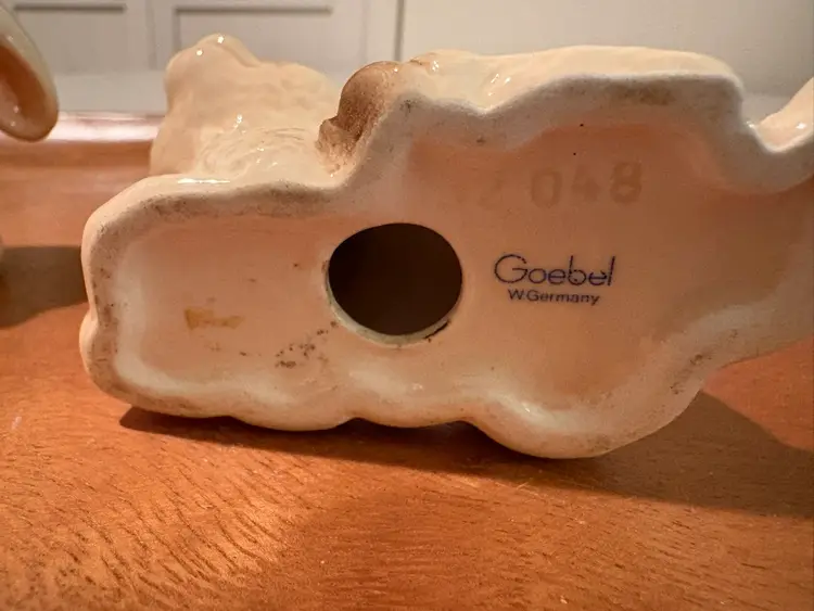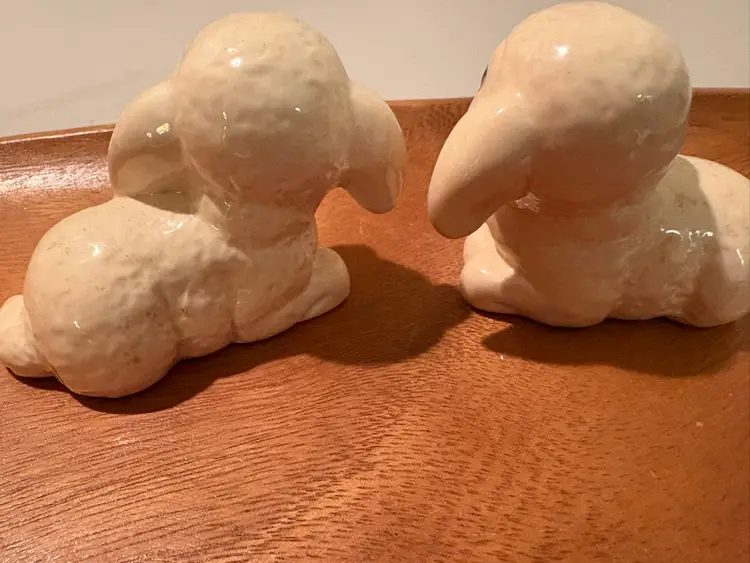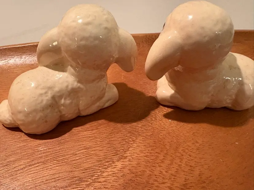 This product is a pair of vintage Goebel white resting lambs, made of porcelain and manufactured in Germany in 1986. The figurines are part of the Animals collection and have a glossy finish. Measuring 3 inches in length, these original pieces are perfect for any room, especially for Easter decor. The beige color and lamb subject make them a charming addition to any collector's display.