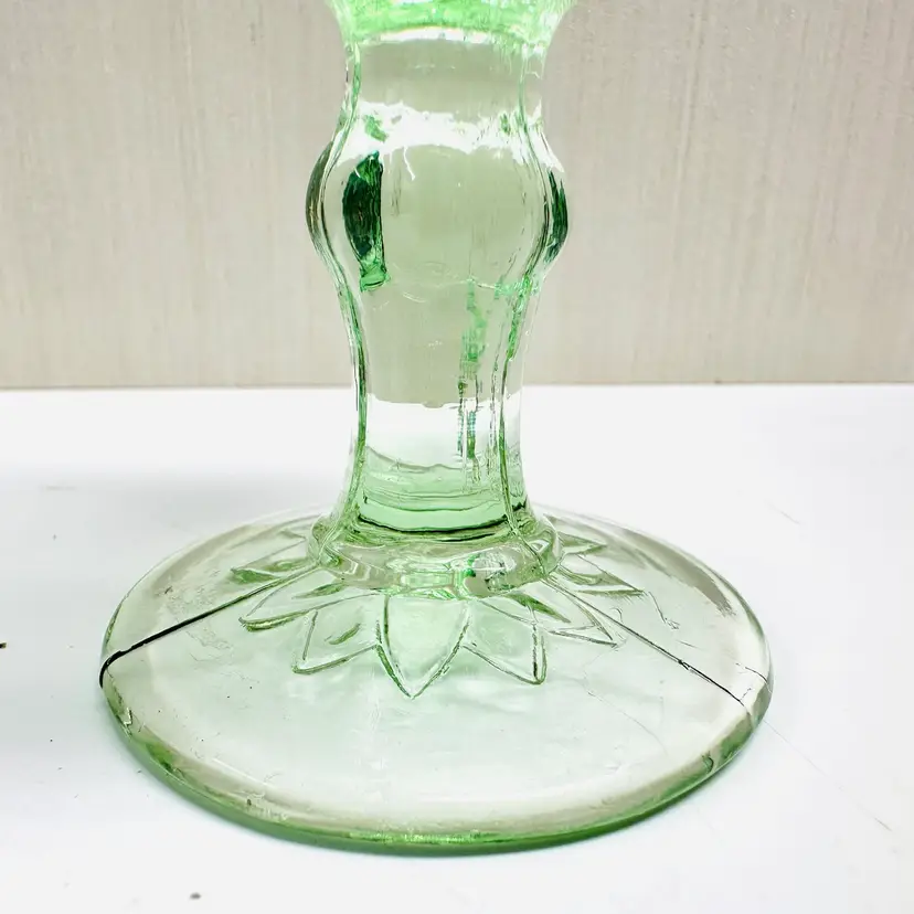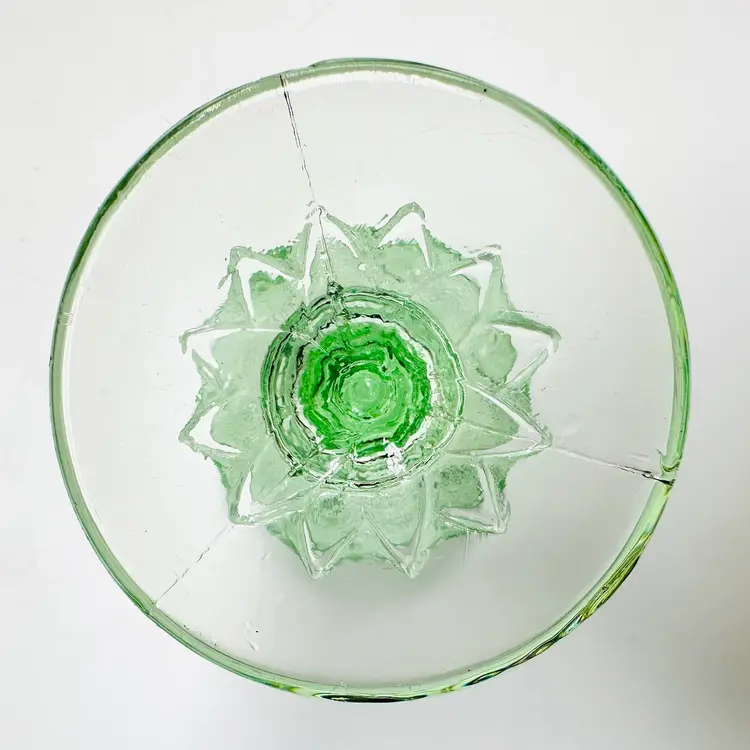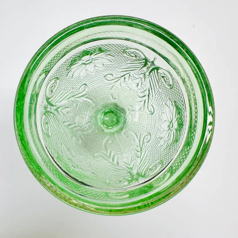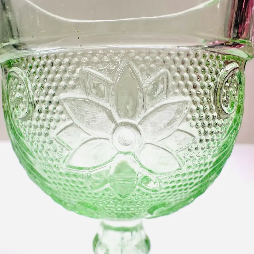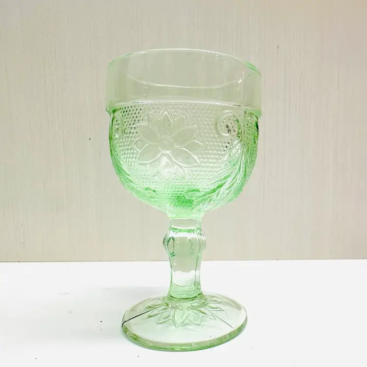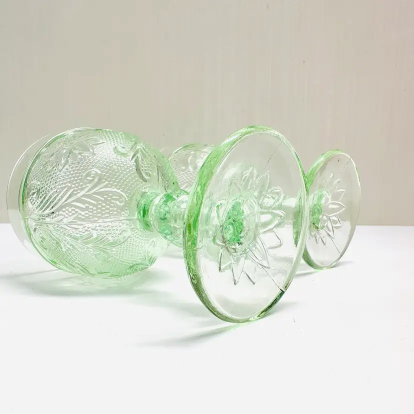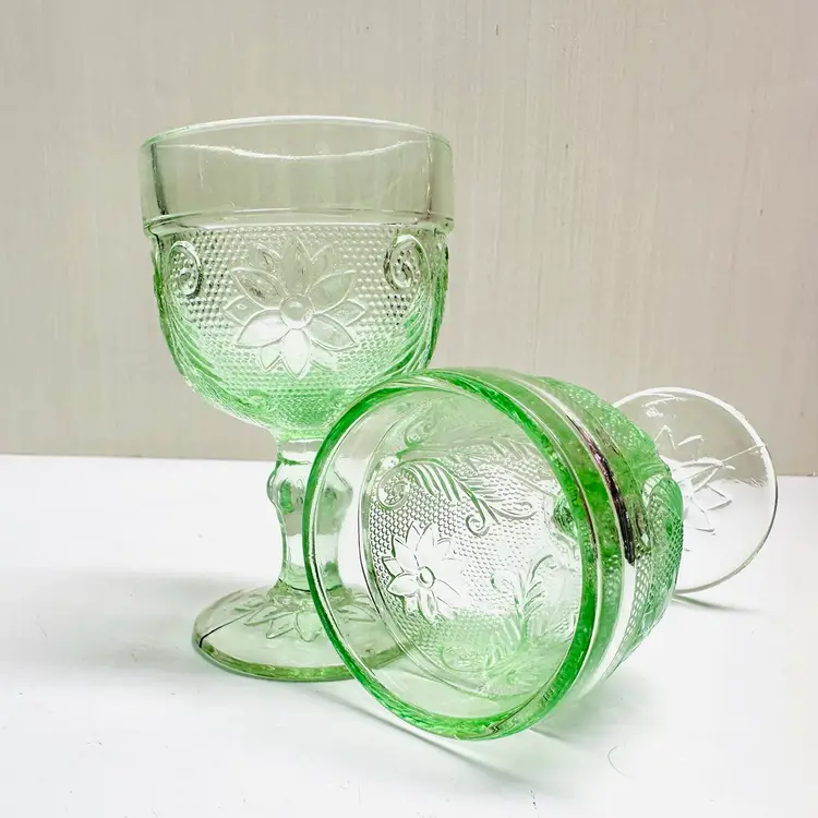 A pair of previously owned Indiana Glass Tiara Chantilly green mini goblet, cordial, or dessert glass with flowers and scrolls. There are no maker marks.