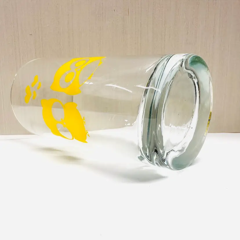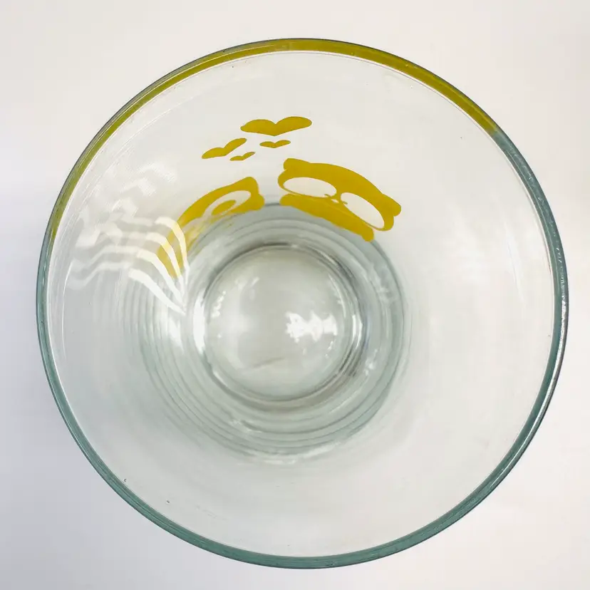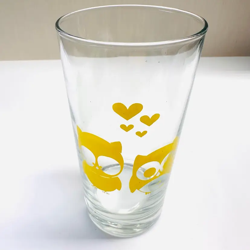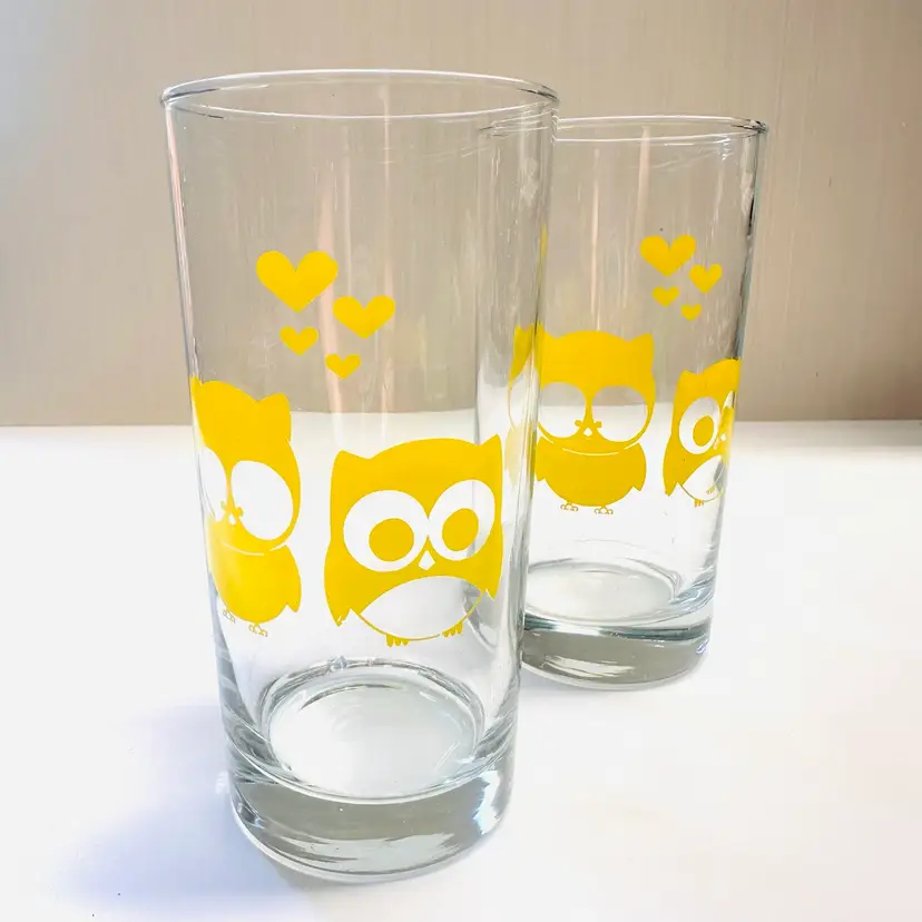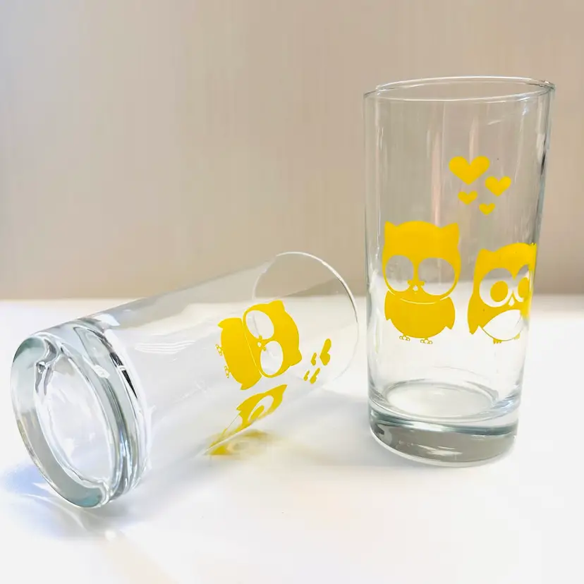 A pair of previously owned yellow owl with heart drinking glasses. Best to hand wash. There are no maker marks.