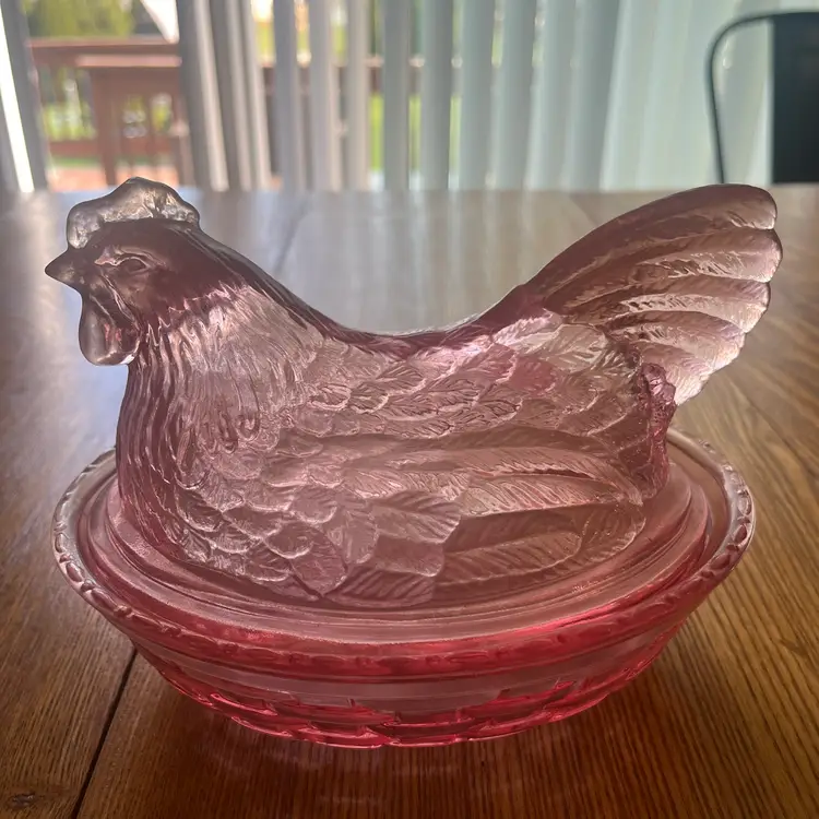 Glassware shaped like animals, particularly hens on nests, has a long history in decorative arts, often serving as candy dishes or butter dishes. These items gained significant popularity in the mid-20th century, with many manufacturers producing them in various colors and styles, often associated with Depression glass or mid-century collectibles.