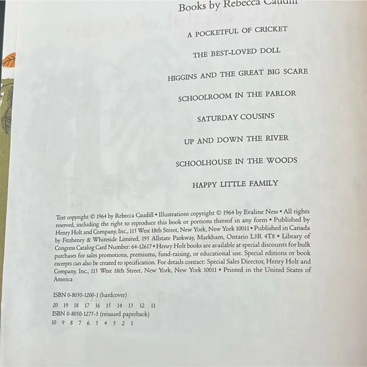 This is a first edition (1964) PB copy of the children's book A Pocketful of Cricket by Rebecca Caudill, illustrated by Evaline Ness.