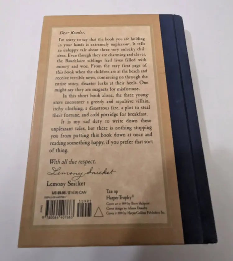 Armed with only Violet’s knack for inventing, Klaus’s love of books, and Sunny’s sharp four teeth, the orphans must outsmart a villain who will stop at nothing—including kidnapping and physical peril—to get what he wants.