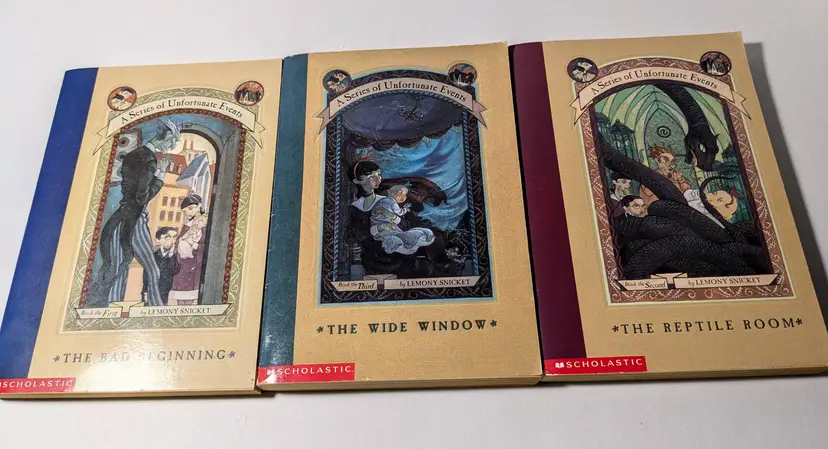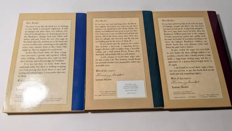 Dear Reader. I'm sorry to say that the book you are holding in your hands is extremely unpleasant. It tells an unhappy tale about three very unlucky children. Even though they are charming and clever, the Baudelaire siblings lead lives filled with misery and woe. From the very first page of this book when the children are at the beach and receive terrible news, continuing on through the entire story, disaster lurks at their heels. One might say they are magnets for misfortune. In this short book alone, the three youngsters encounter a greedy and repulsive villain, itchy clothing, a disastrous fire, a plot to steal their fortune, and cold porridge for breakfast. It is my sad duty to write down these unpleasant tales, but there is nothing stopping you from putting this book down at once and reading something happy, if you prefer that sort of thing.