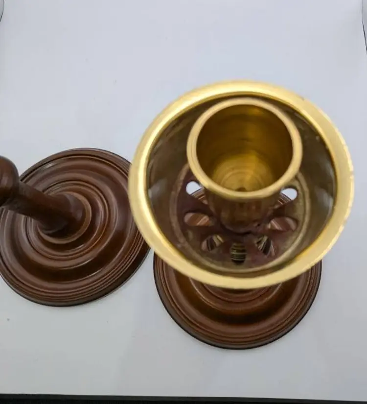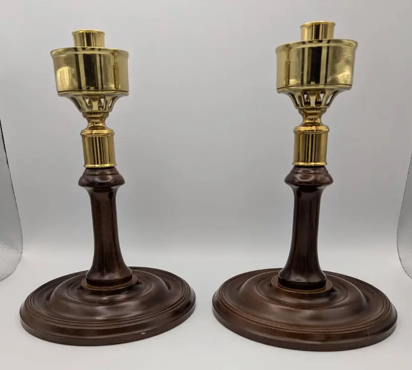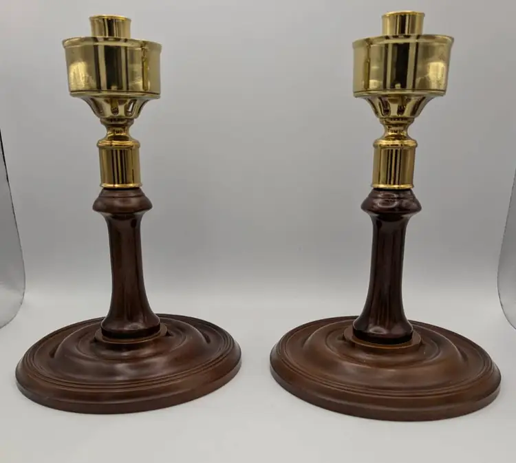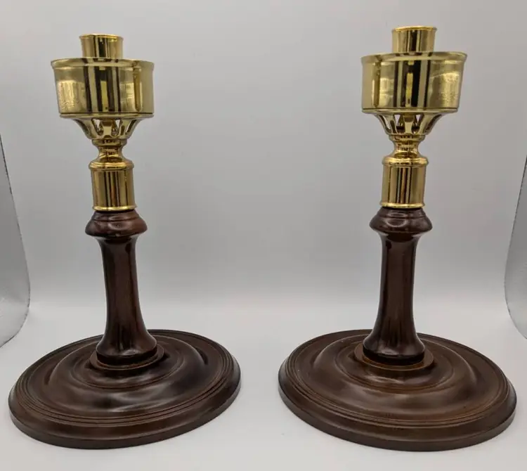 This is set of two- Vtg Virginia Metalcrafters CW-16-80 Candle Holders by Williamsburg Restoration. These seem to be hard to find. They are a great collectible - especially for those who are inspired by colonial Americana. Handmade in the USA It has a mahogany wooden pedestal and brass socket Stands 8.5 inches tall with a 5.5 inch diameter base.