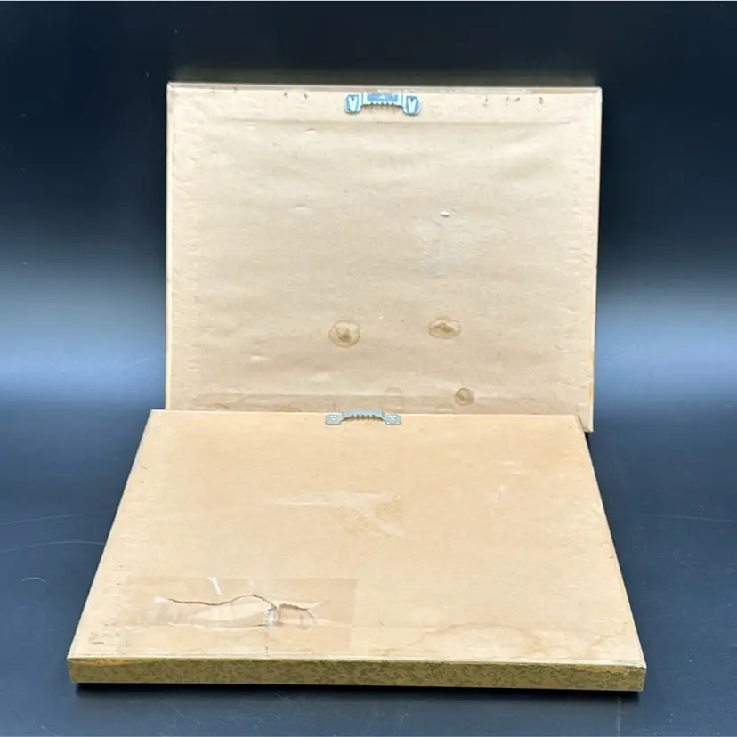 71/2”T91/“W no chips, cracks or breaks and wonderful condition. The paper on one of the pictures is torn with a piece of tape over it other than that they are in vintage condition.