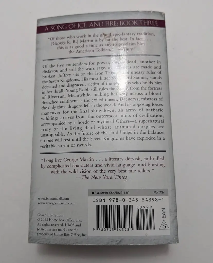 Of the five contenders for power, one is dead, another is defeated, and still the wars rage, as alliances are made and broken. Joffrey sits on the Iron Throne, his uneasy rule of the Seven Kingdoms. His most bitter rival, Stannis, stands defeated and disgraced, victim of the sorcery who holds him in her thrall. Young Robb still rules the north from the fortress of Riverrun. Meanwhile, making her way across a blood-drenched continent is the exiled queen, Daenerys, mistress of the only three dragons left in the world. And as opposing forces maneuver for the final showdown, an army of barbaric wildlings arrives from the outmost limits of civilization, accompanied by a horde of mythical Others—a supernatural army of the living dead whose animated corpses are unstoppable. As the future of the land hangs in the balance, no one will rest until the Seven Kingdoms have exploded in a veritable storm of swords.