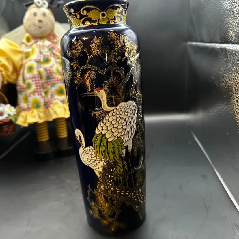 Traditional Kutani ware often features motifs such as kacho (flowers and birds), which is evident in the detailed depiction of the cranes and pine trees on this piece. ®