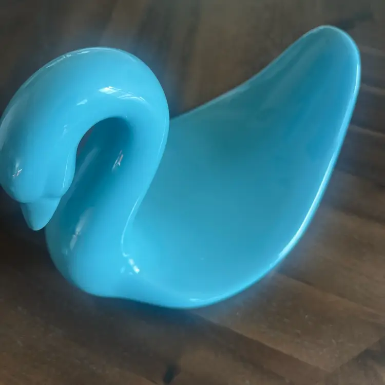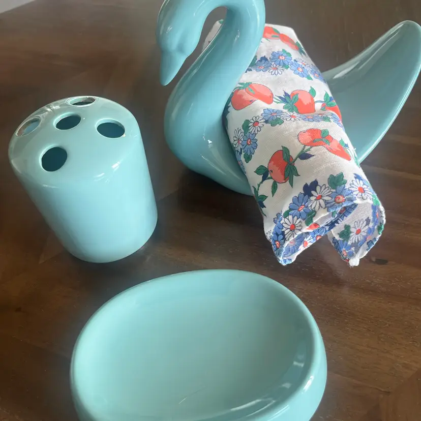 Swan motifs, in particular, have long been associated with grace, beauty, and elegance, making them a favored design element for decorative objects. The inclusion of a toothbrush holder and soap dish alongside a swan-shaped napkin or towel holder suggests a coordinated bathroom or vanity set, typical of the era's approach to interior design. Such sets aimed to bring a touch of charm and order to everyday spaces.