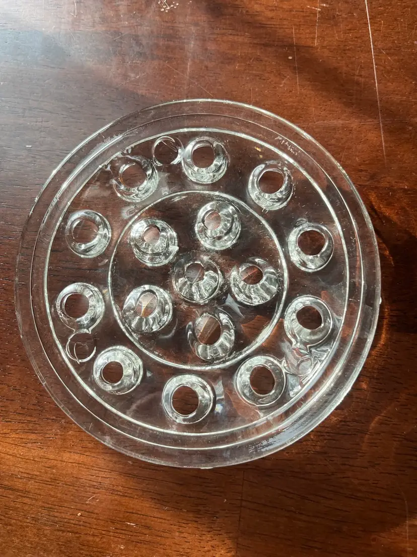 This particular type of glass flower frog, with its multiple holes arranged in a circular pattern, was widely produced by various glass manufacturers. They were often sold as standalone items or as part of a larger decorative bowl or vase set. Their enduring popularity stems from their practicality in creating beautiful floral arrangements and their vintage charm, making them sought-after by collectors of home decor and floraliana.