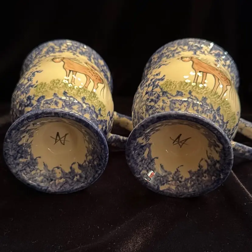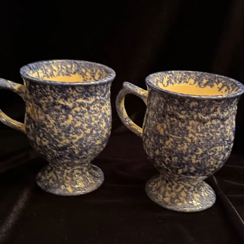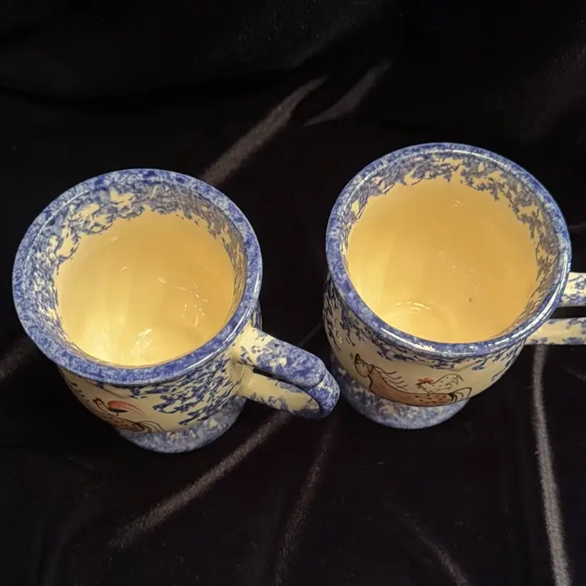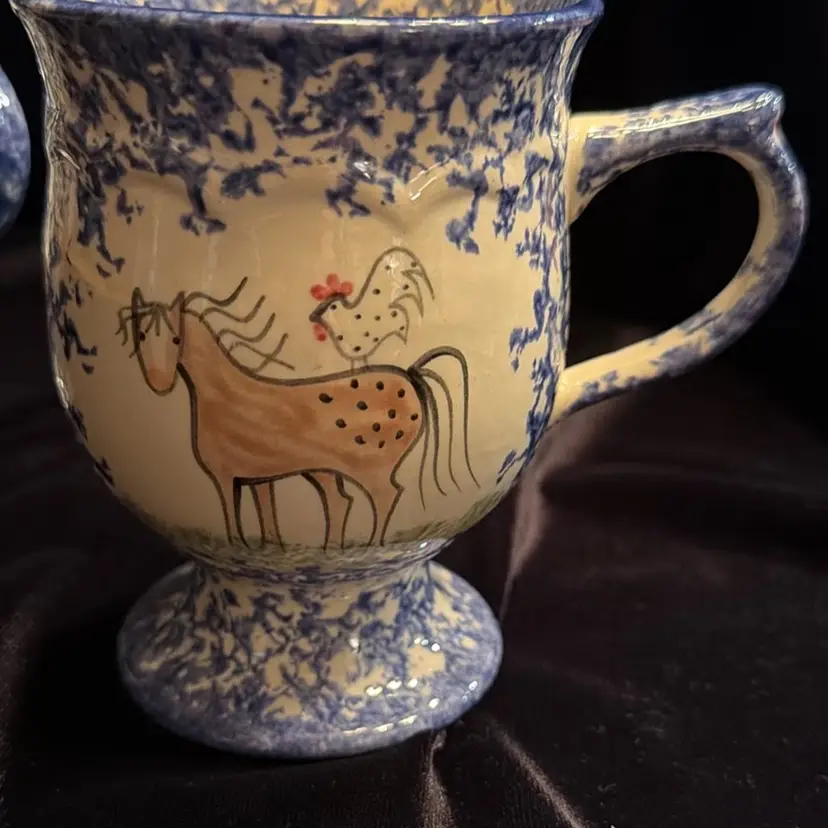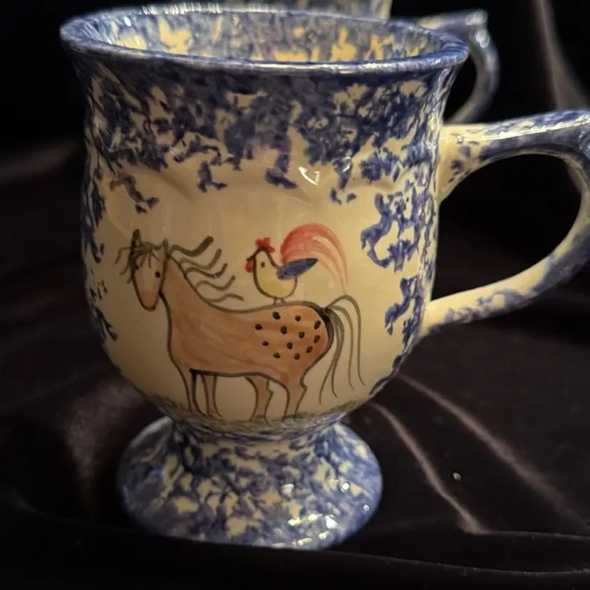 A Vintage pair of Molly Dallas Spatterwsre 8 Oz. Coffee mugs, Horses & Roosters Pattern In Blue.