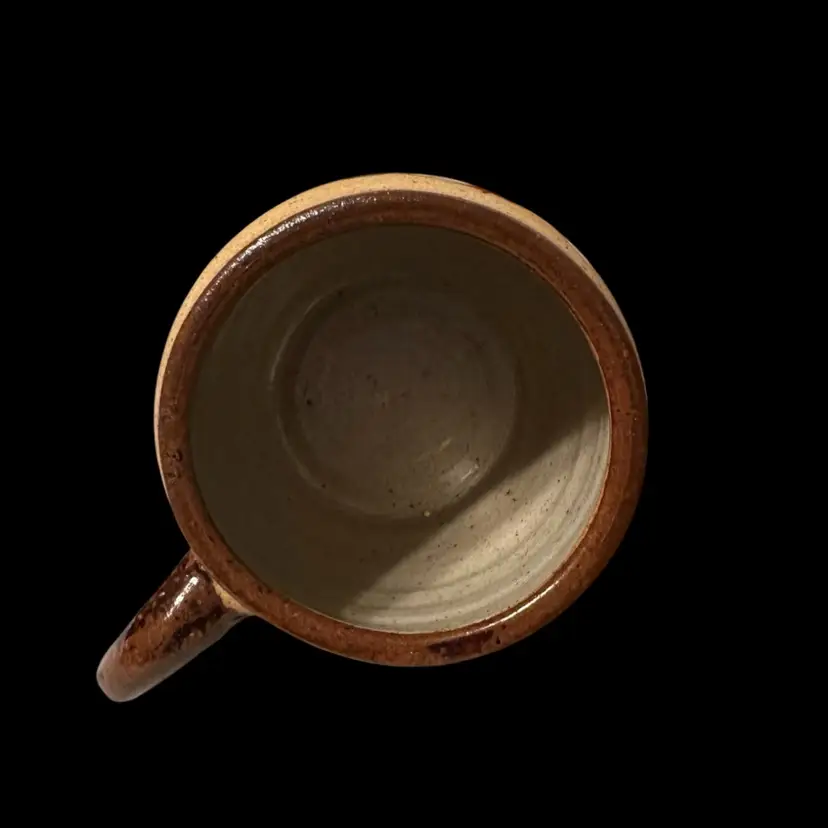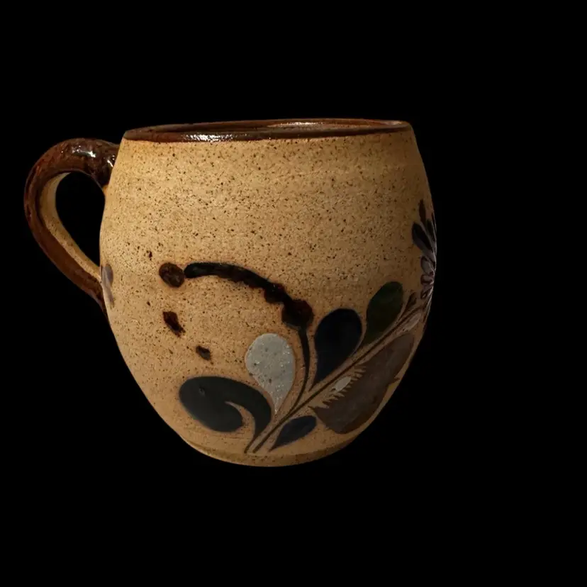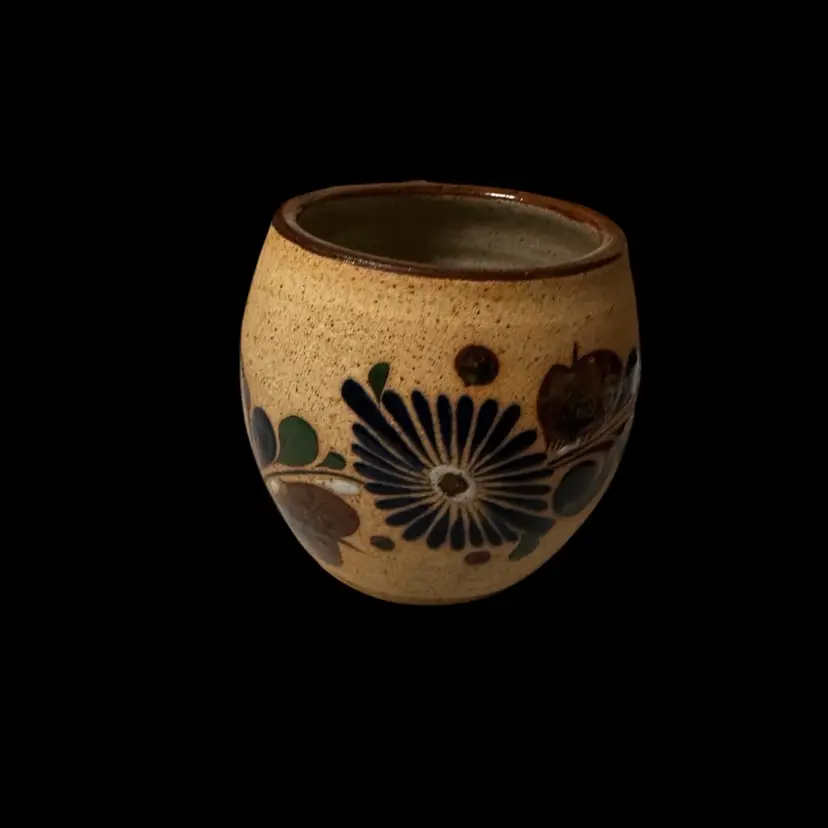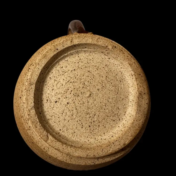 Sandstone or clay with a textured, unglazed exterior and a glazed interior for functionality. 4.5 inches tall and 5 inches wide.