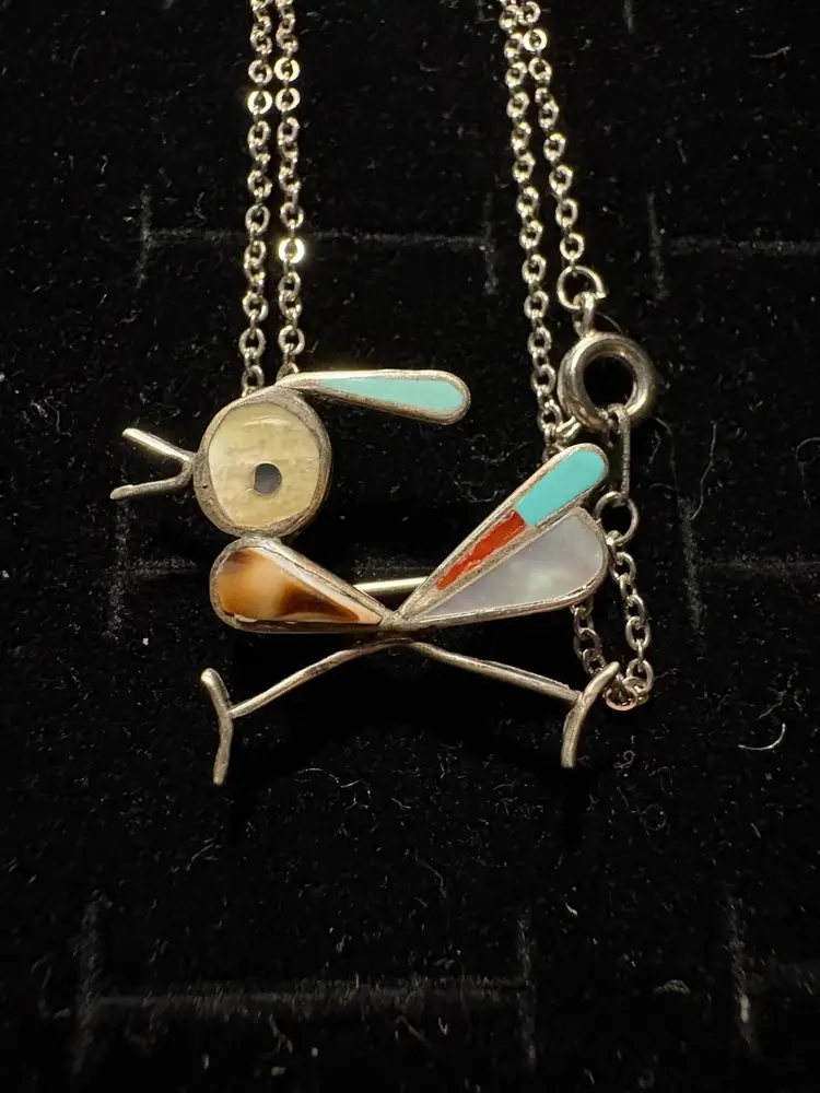 This particular piece, a roadrunner pendant, exemplifies the Zuni tradition of depicting animals and natural elements with meticulous detail and colorful materials. The use of turquoise, red stone, and possibly shell or other colored stones against a silver base is characteristic of their work. Such pieces are highly collectible and represent a significant aspect of Native American art and culture.