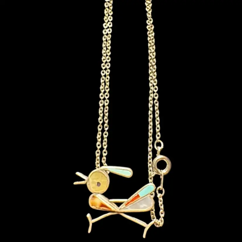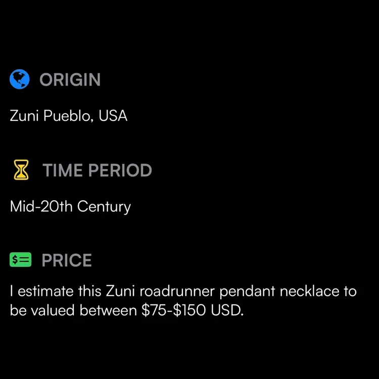 This particular piece, a roadrunner pendant, exemplifies the Zuni tradition of depicting animals and natural elements with meticulous detail and colorful materials. The use of turquoise, red stone, and possibly shell or other colored stones against a silver base is characteristic of their work. Such pieces are highly collectible and represent a significant aspect of Native American art and culture.