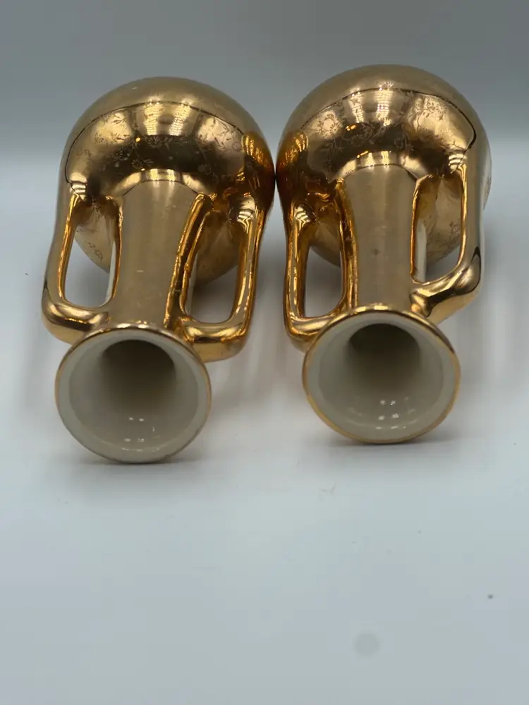 The 6 inch tall vases feature a double-handle "urn" or "amphora" shape covered in a gold finish with a subtle floral pattern. The items were made in the United States, likely during the mid-20th century.