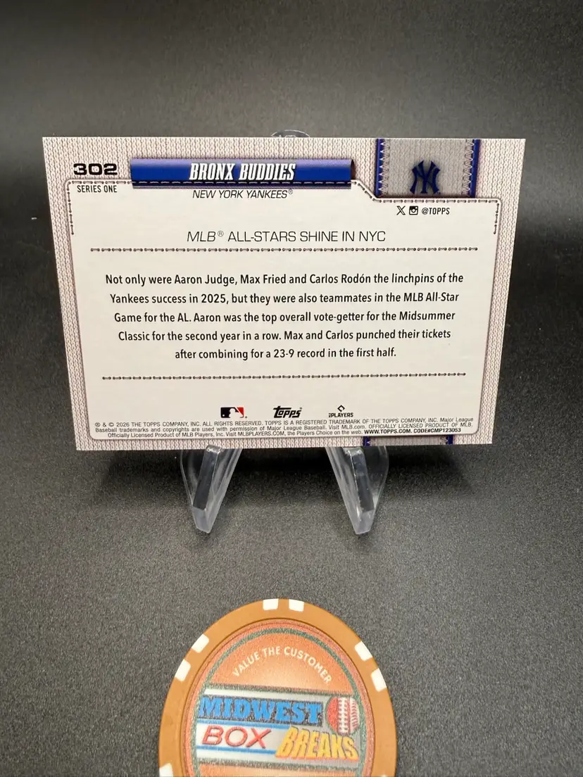 This is a Sand Glitter RC parallel of Aaron Judge and others of the New York Yankees. This is from Topps 2026 flagship release.