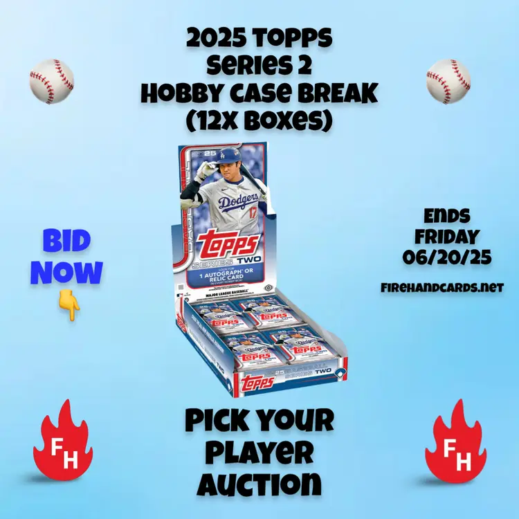 You are bidding on all the cards of the player listed in the title in this Hobby Case (12x Hobby Boxes) of 2025 Topps Series 2 Baseball Cards. Auctions end Friday 6/20/2025 and Case will be opened LIVE during the day on Saturday 6/21/2025. Opening will be viewable & simulcast on Firehand Cards District as well as YouTube. US Shipping is $5.00 for your first auction spot won and $.25 for each spot won after that. Any spot won where no cards of the player are found in the box will receive a bonus card from Firehand Cards' collection. Any hit pulled (Cut or Buyback Autos, Sketches, Hidden Gems etc) of a player who is NOT listed in the auction will be assigned to by draw between all participants. Any dual or multi-player #'d or auto cards featuring multiple players will be assigned live between the spots depicted on the card.