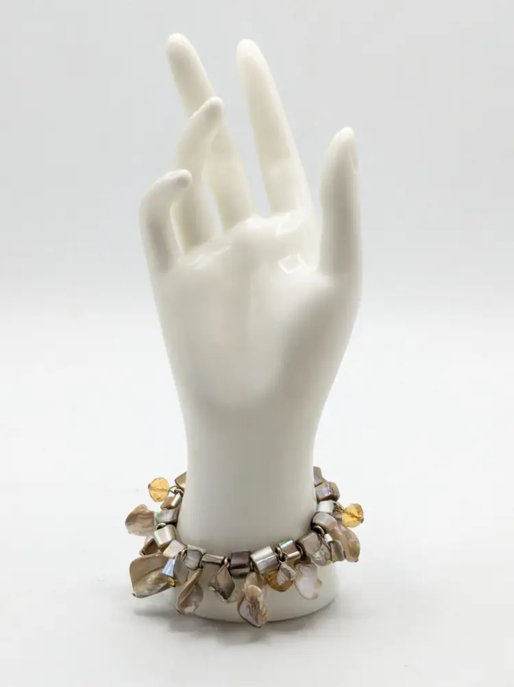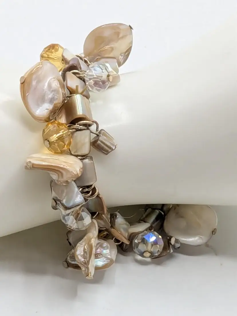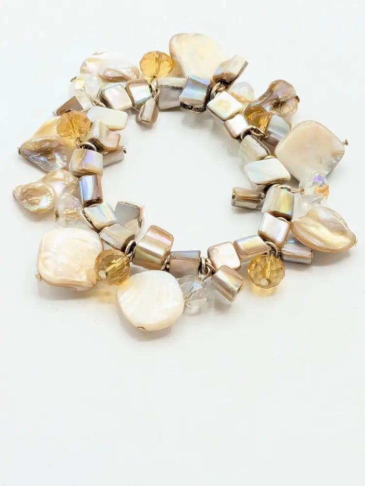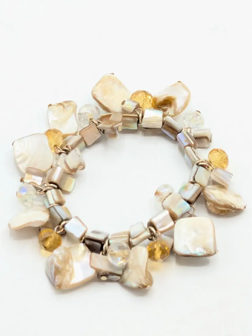 Good condition. Features mother of pearl and crystal glass beads. Color is off white, tan, gold hues and pale yellow. Stretch design for easy wear. Measures 6 1/2" but is a stretch bracelet. (EN1)