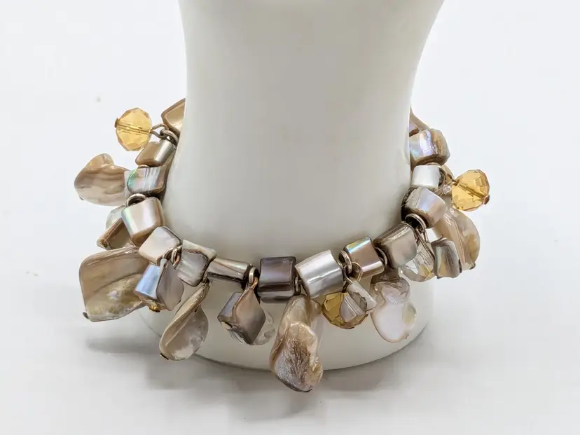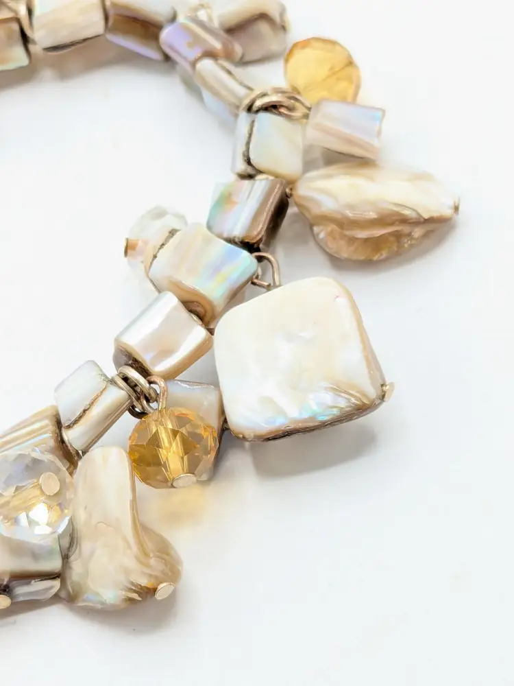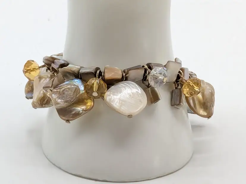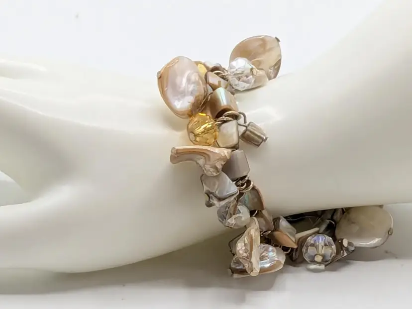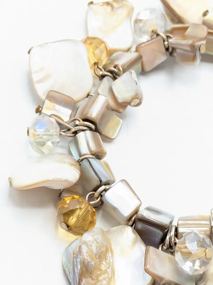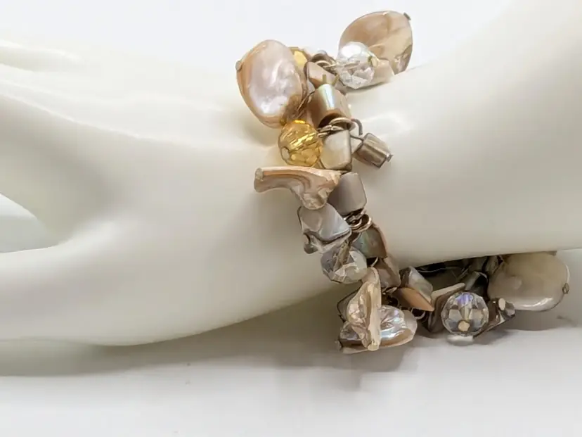 Good condition. Features mother of pearl and crystal glass beads. Color is off white, tan, gold hues and pale yellow. Stretch design for easy wear. Measures 6 1/2" but is a stretch bracelet. (EN1)