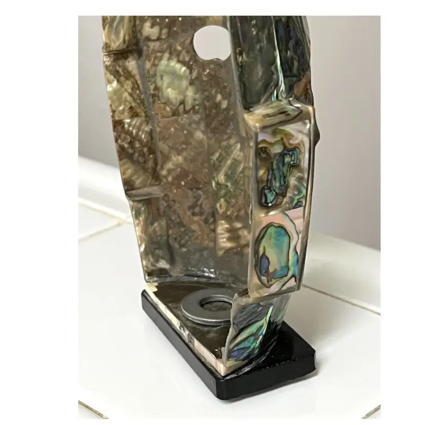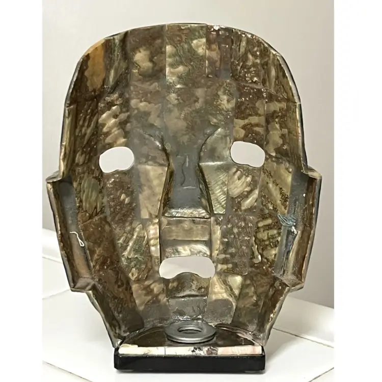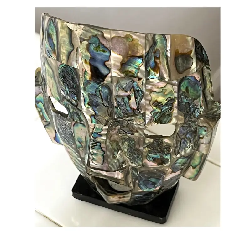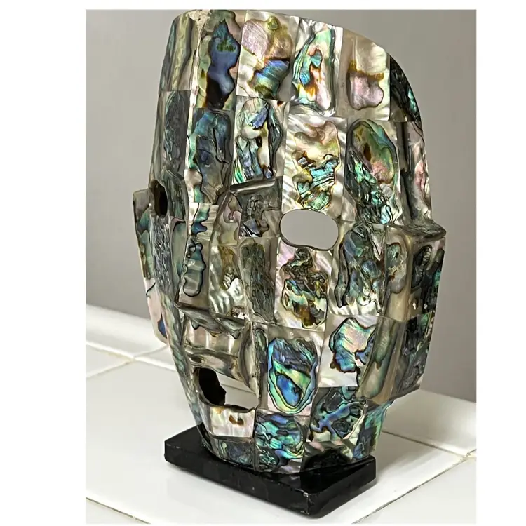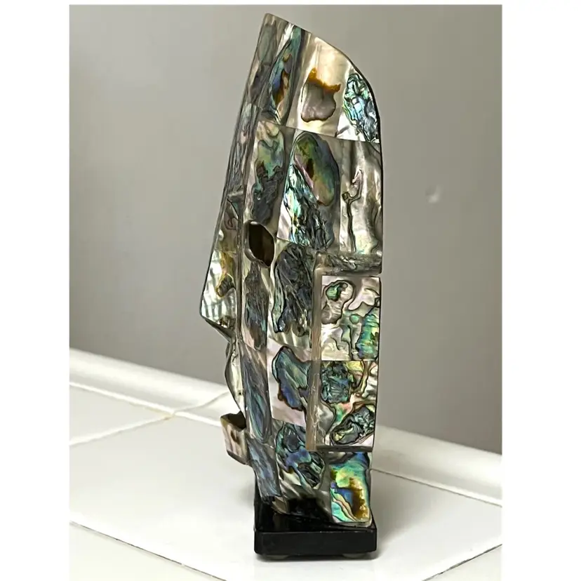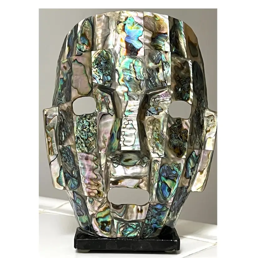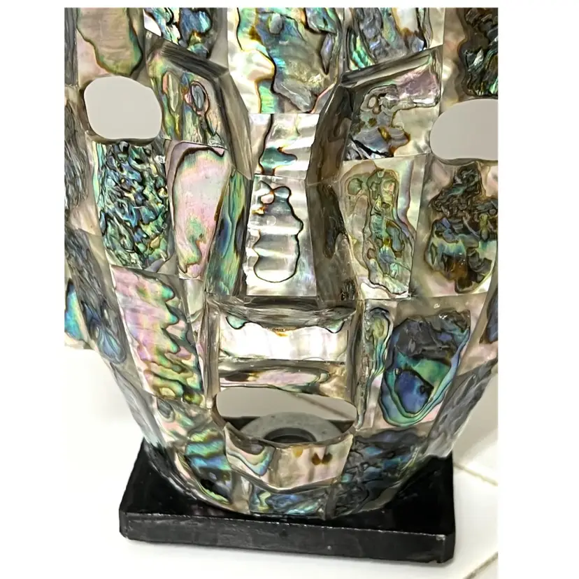 Abalone Mother of Pearl Shell Mayan Aztec Face Mask Decor Sculpture On Base 7 in Height, 3x1.5 in base. Small chips on the base and right side of the mask (SEE ALL PHOTOS)