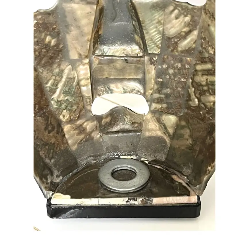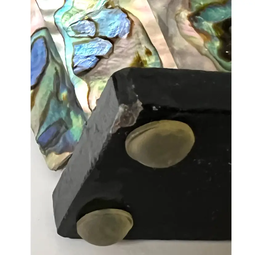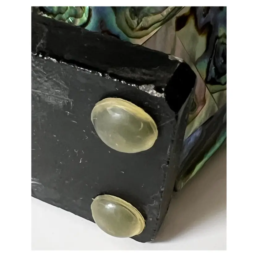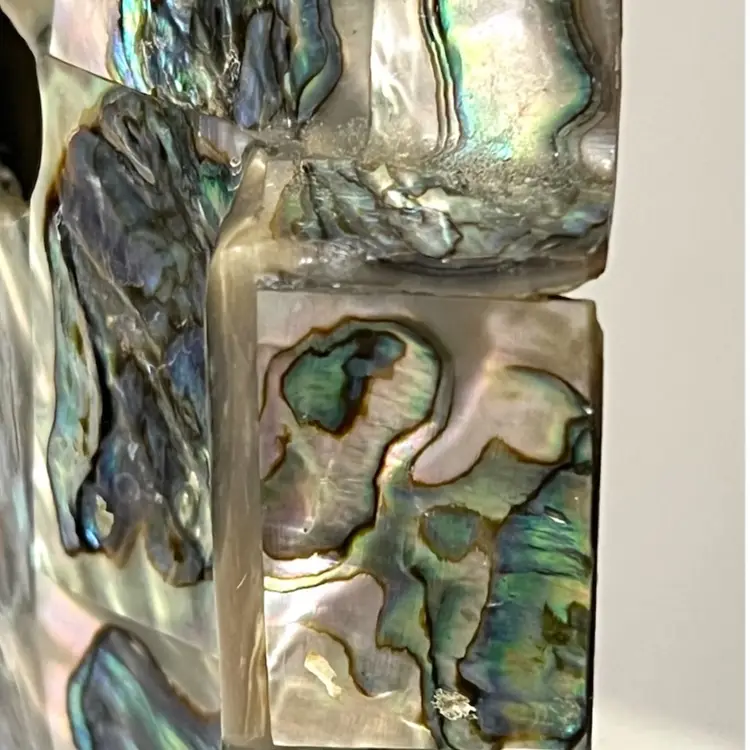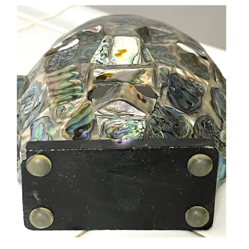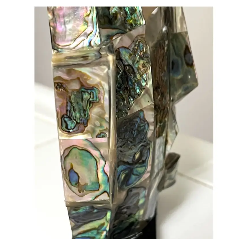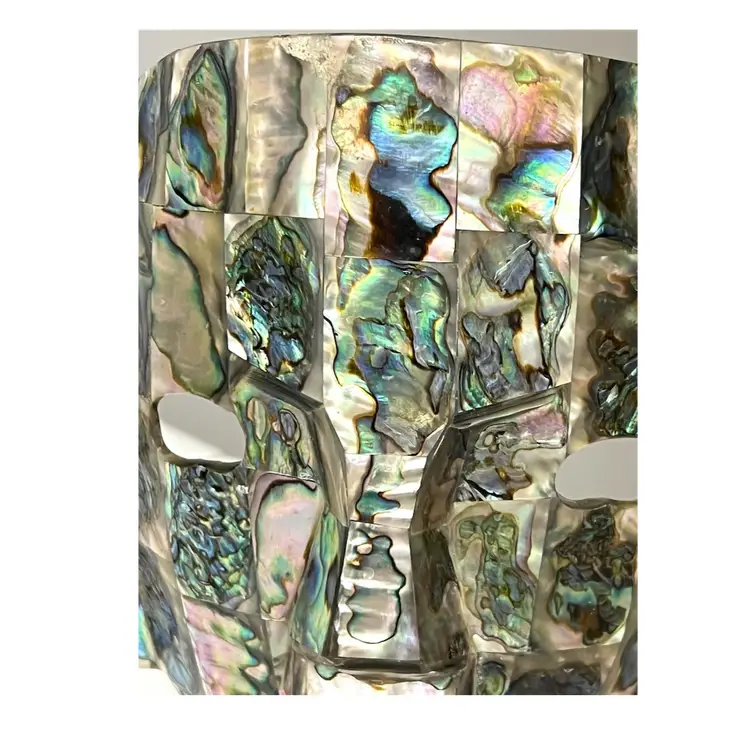 Abalone Mother of Pearl Shell Mayan Aztec Face Mask Decor Sculpture On Base 7 in Height, 3x1.5 in base. Small chips on the base and right side of the mask (SEE ALL PHOTOS)
