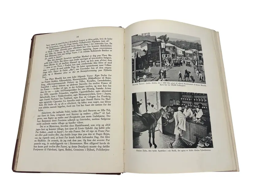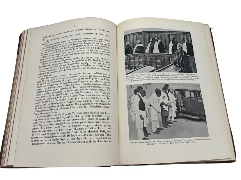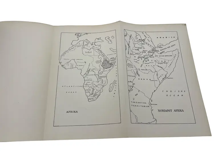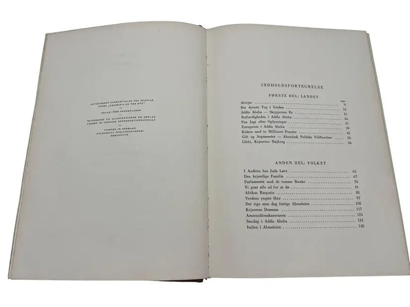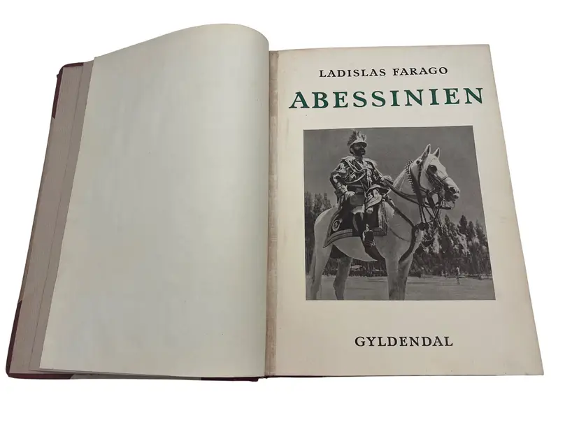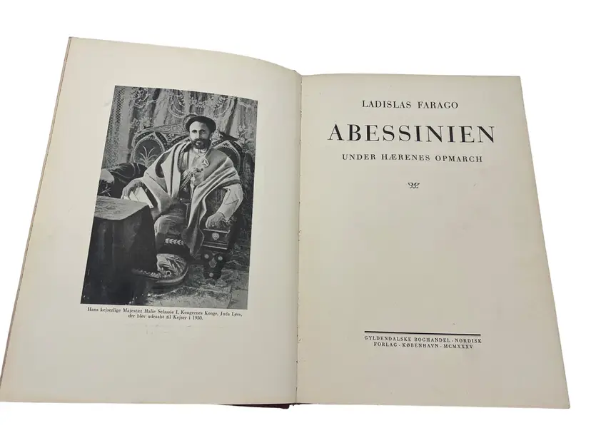 Danish‐language edition (Gyldendalske Boghandel / Nordisk Forlag, København) of "Abessinien: Under Hærenes Opmarch" by Ladislas Farago. Measures 9.75″ × 7″, 198 numbered pages, includes folded map and black and white photographic plates. The book is a contemporary report by Farago of the Italian invasion of Ethiopia.