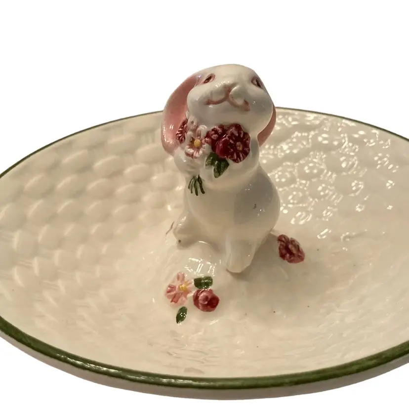 Ceramic, 5.5” wide and 2.5” tall. There is felt glued on bottom. No cracks or chips in porcelain.