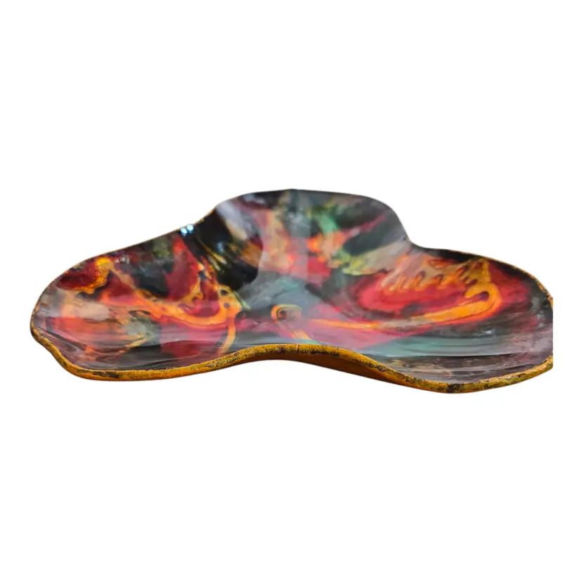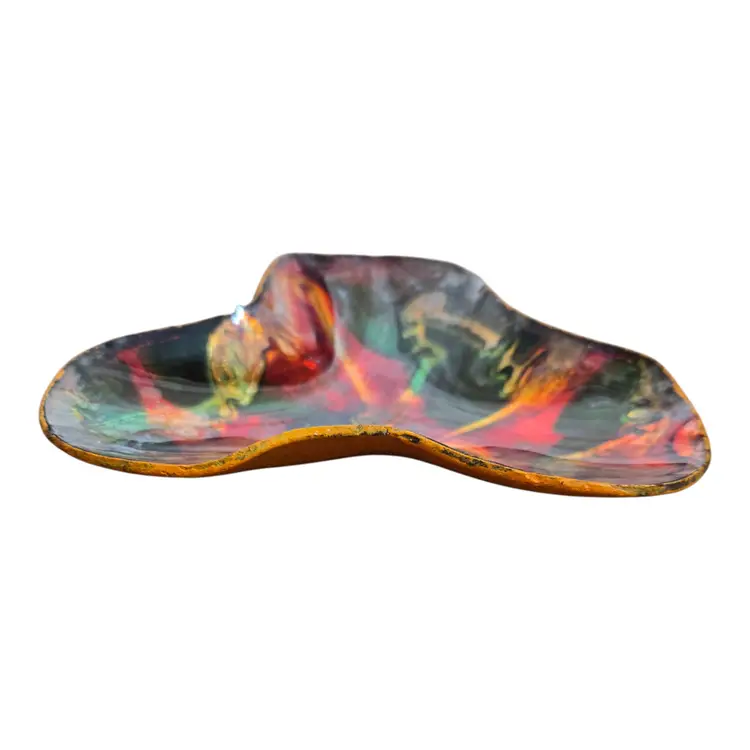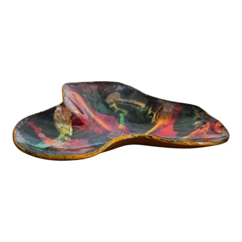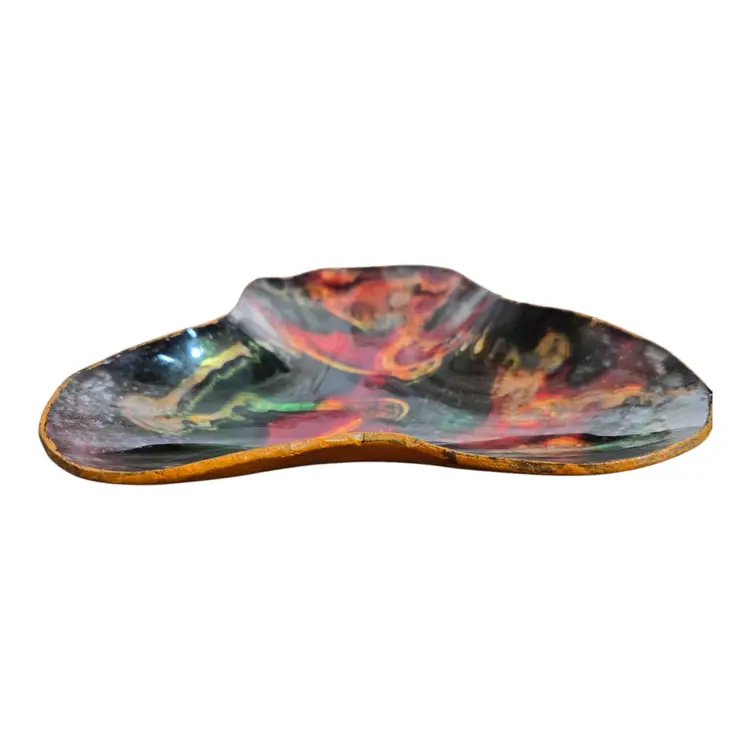 Beautiful and colorful! I believe it is foil art. This was made in Mexico, as marked on the back. It is 6.5 inches wide and 1 inch tall. It weighs 3.7 ounces. There is color wear around the top edge. There are a few rough spots on the top edge, too. Please see pictures, as they are part of the description. I'm not sure what it is made of. The top is coated, probably with acrylic.