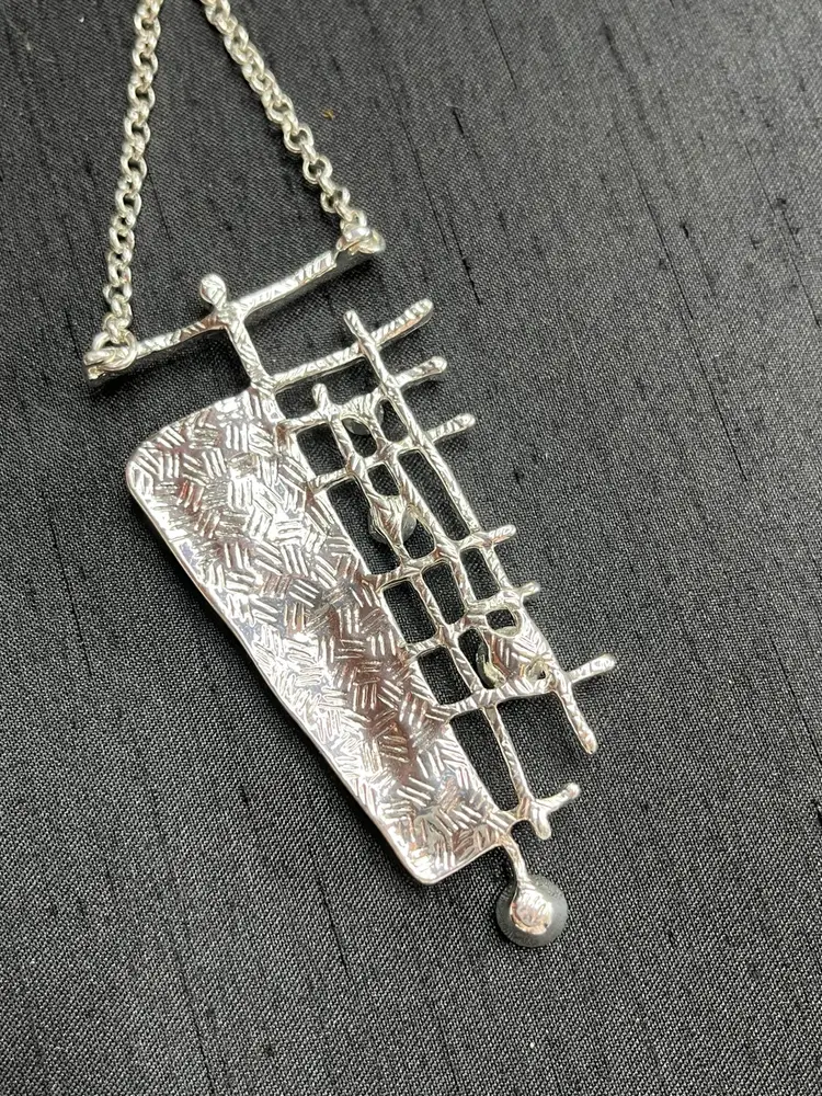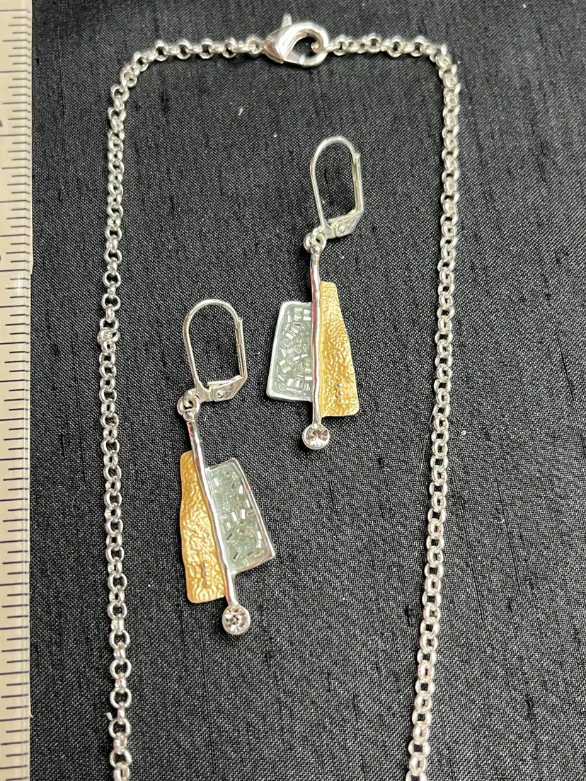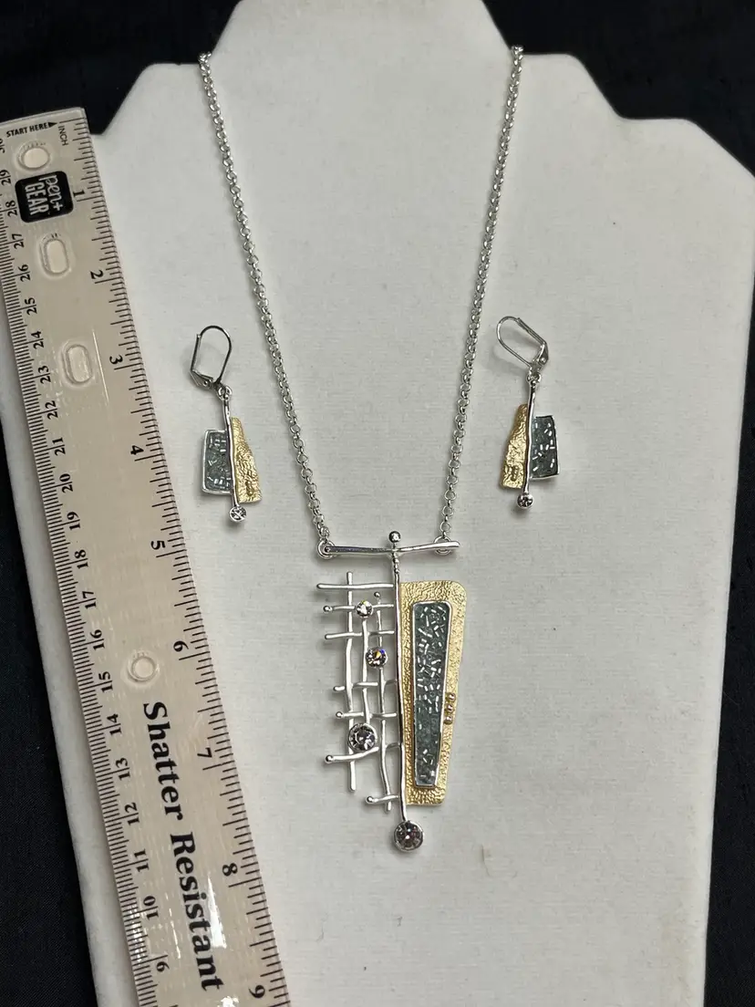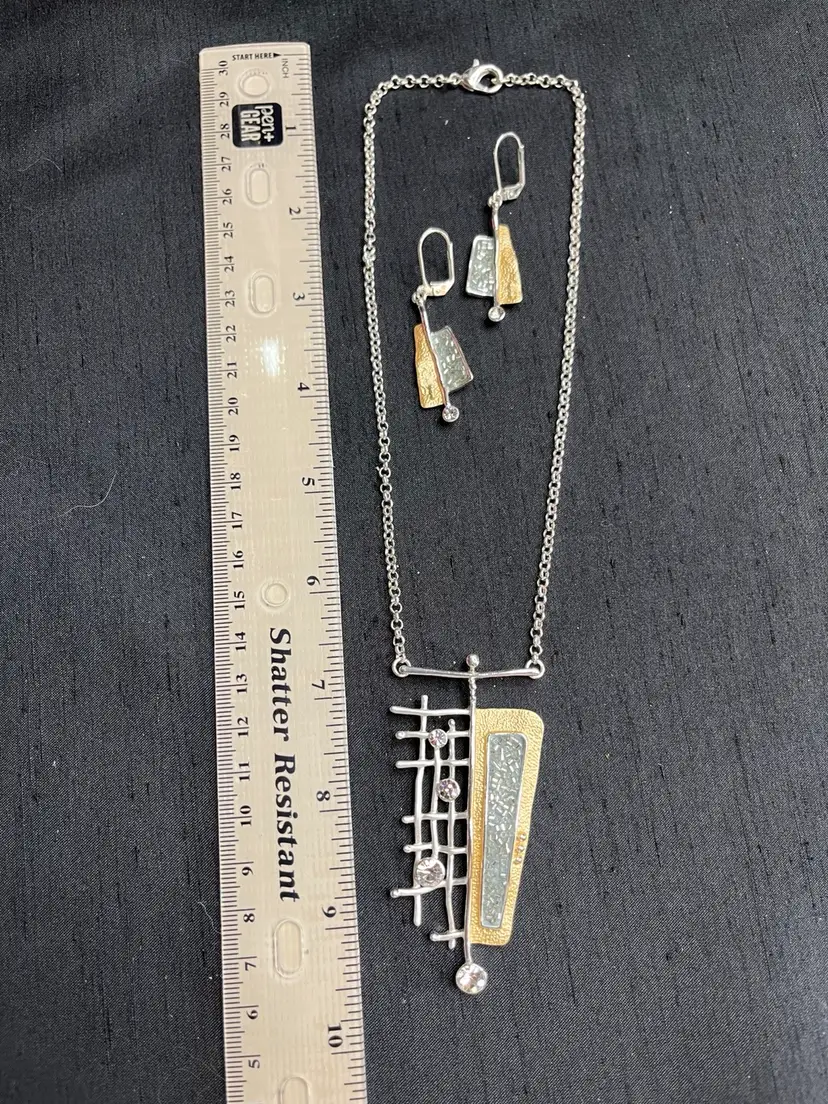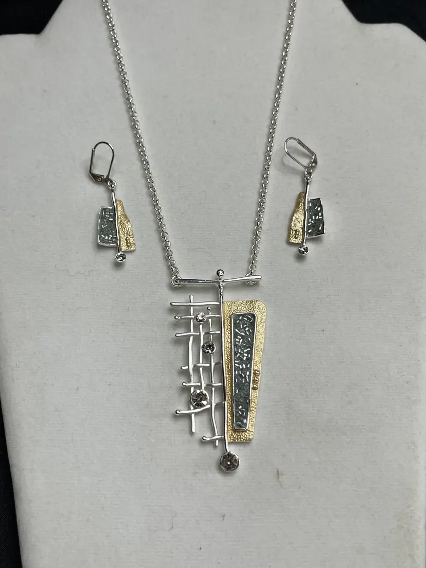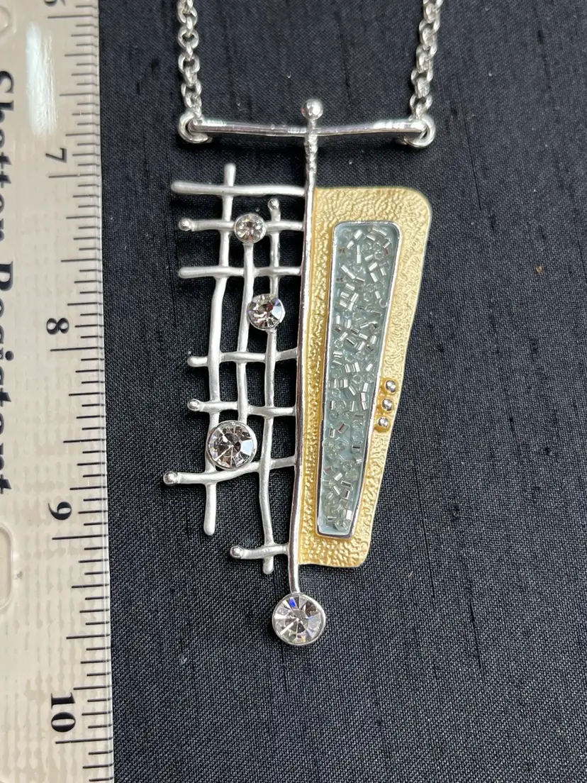 Modernist abstract, silver, and gold tone with rhinestone accents.