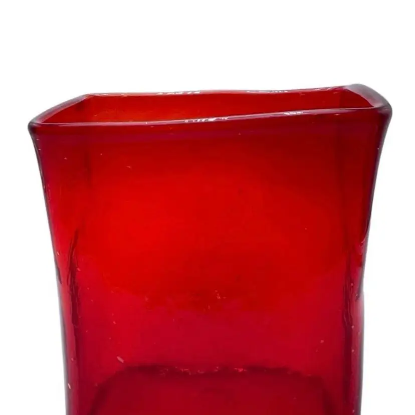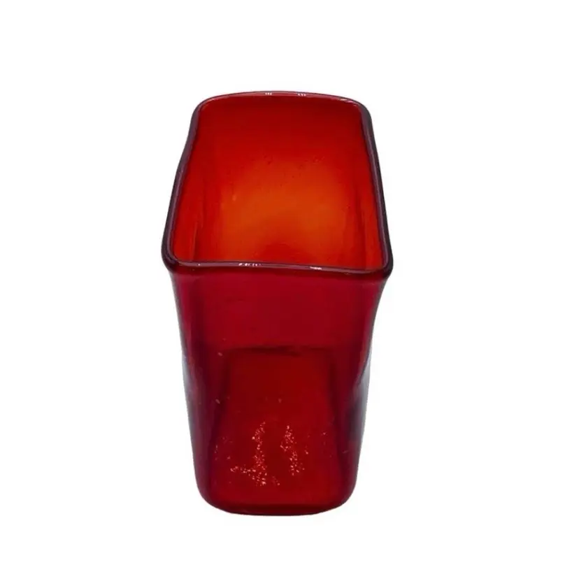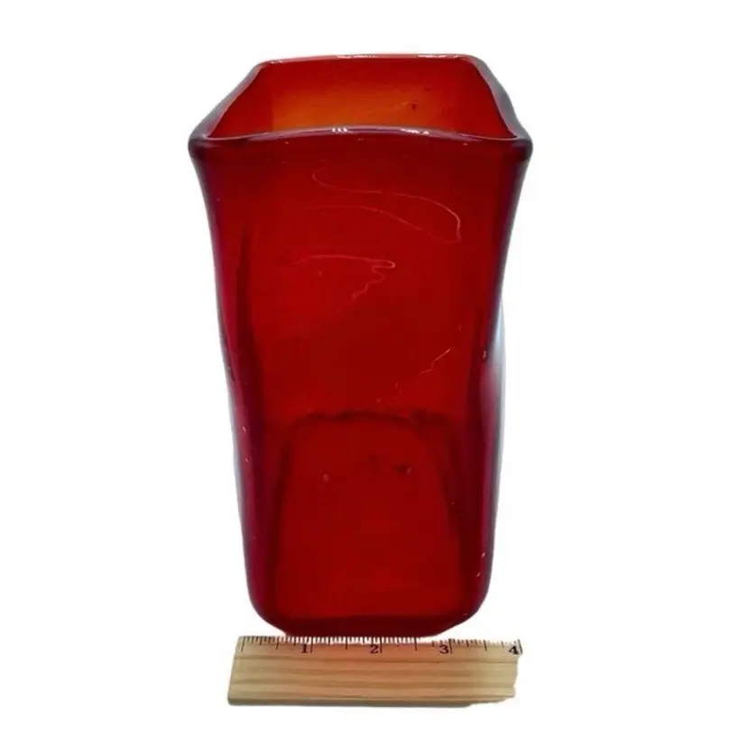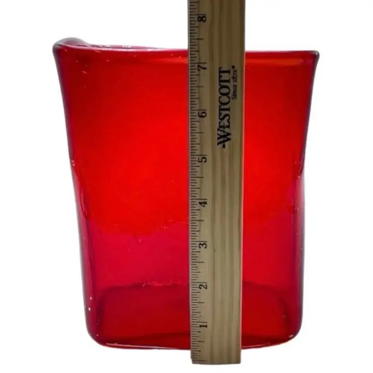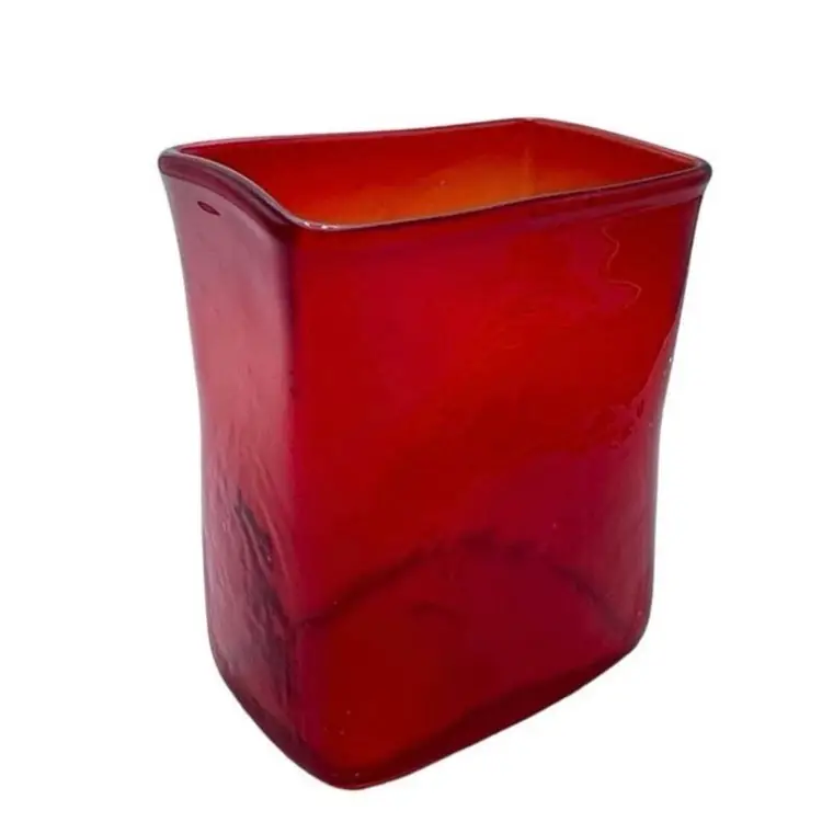 This is a handmade abstract blown art glass ruby red pillow/block vase. It is somewhat textured, and the lip is slanted. Measures approximately 7.25" tall x 5.5" long x 3" wide. No chips or cracks.
