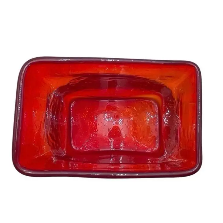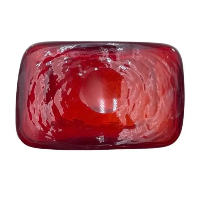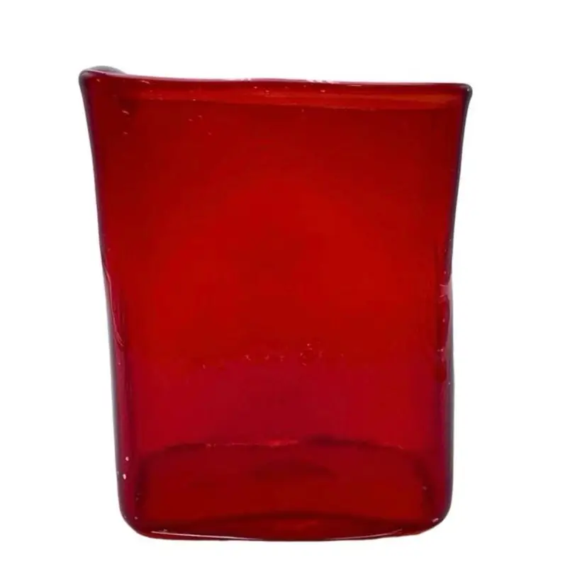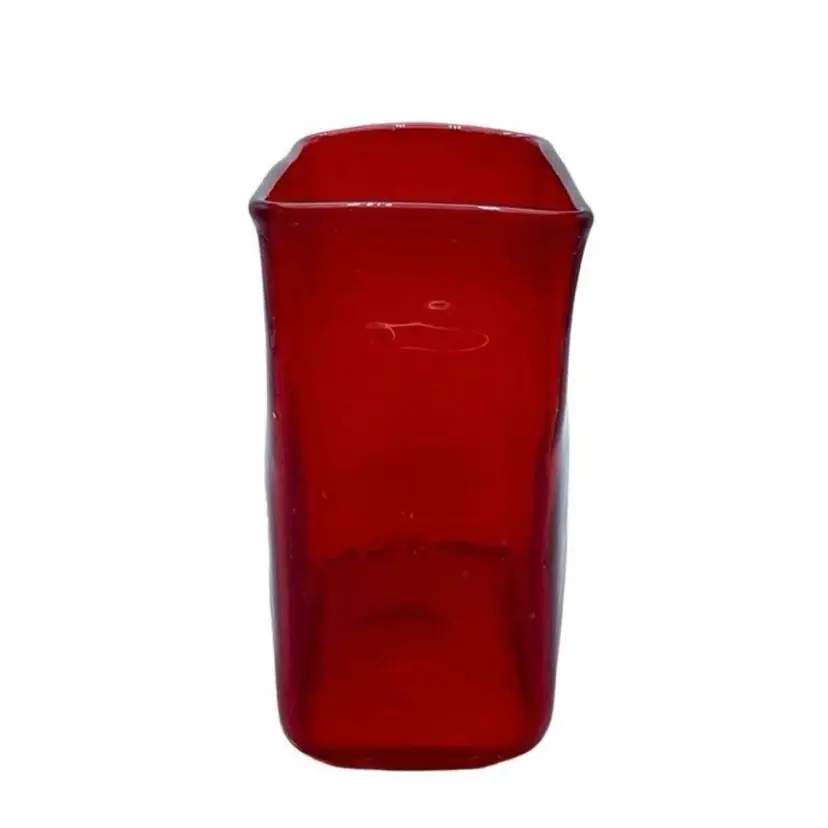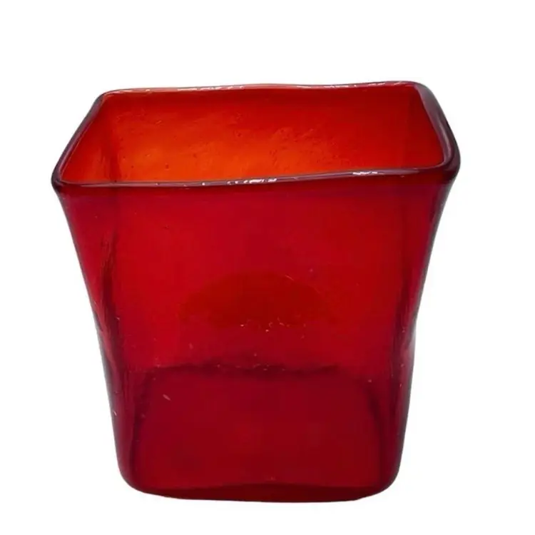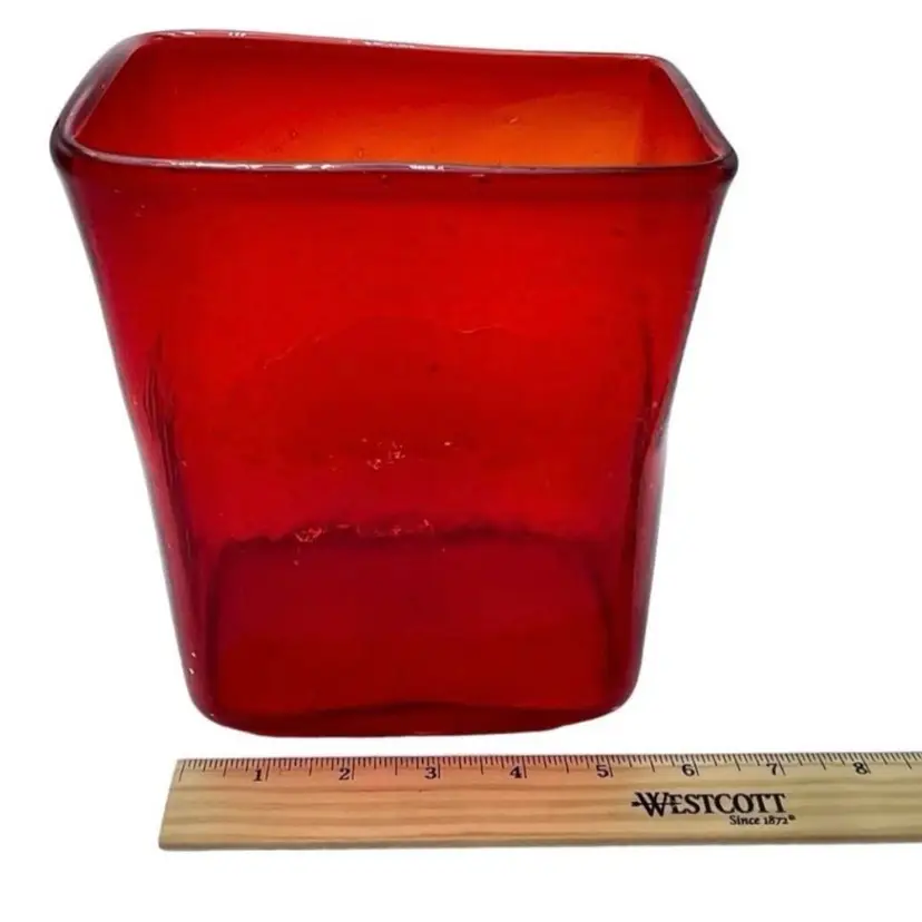 This is a handmade abstract blown art glass ruby red pillow/block vase. It is somewhat textured, and the lip is slanted. Measures approximately 7.25" tall x 5.5" long x 3" wide. No chips or cracks.