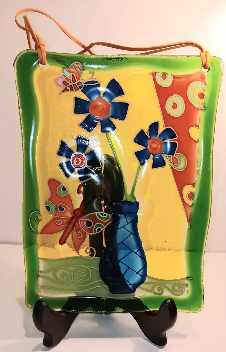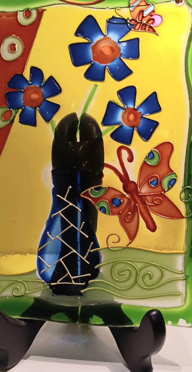Beautiful colors on this glass piece with butterflies and flowers. Does have a little paint loss on the bottom corner. Measuring 8"x 6".