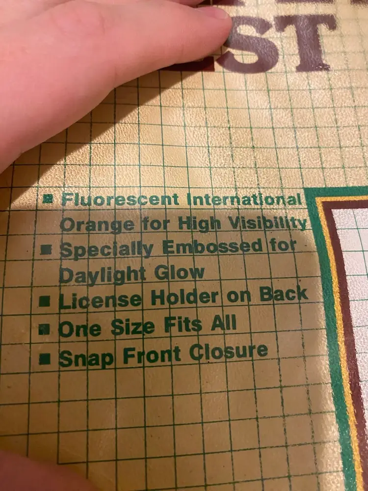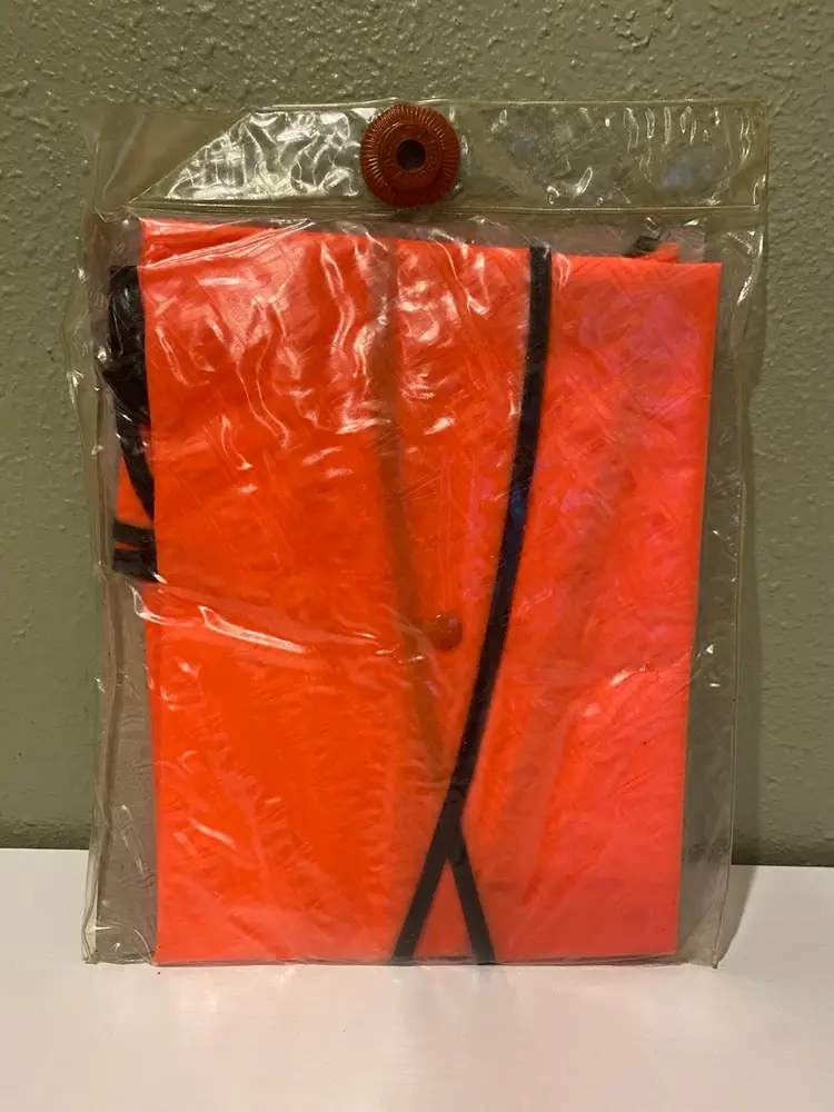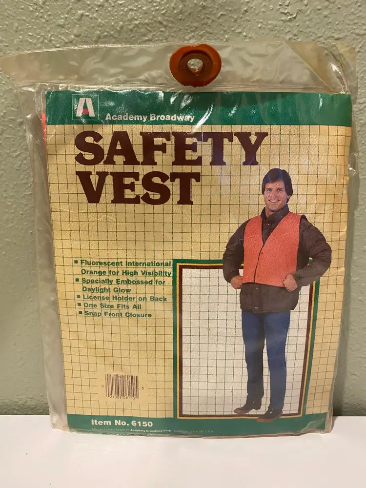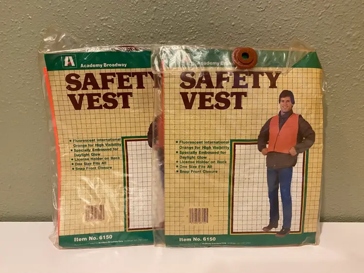 You are purchasing a pair of Fluorescent Orange One-Size Safety Vests by Academy Broadway. These Vests are vintage and still sealed in their original packaging.