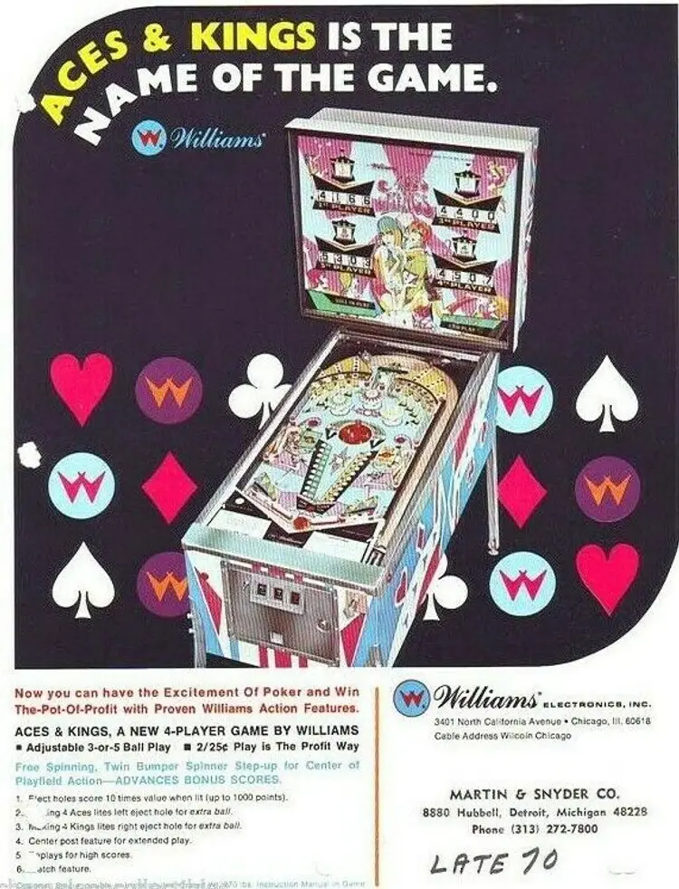 Modified Item: Yes Country/Region of Manufacture: United States Year: 1970 Modification Description: hole punched Brand: Williams Model: Aces & Kings Pinball: Flyer