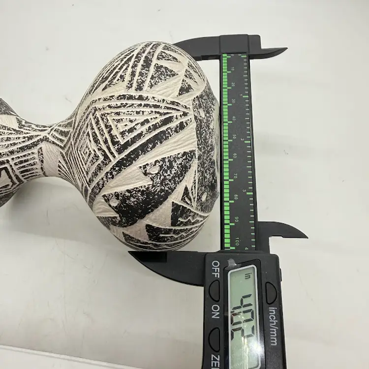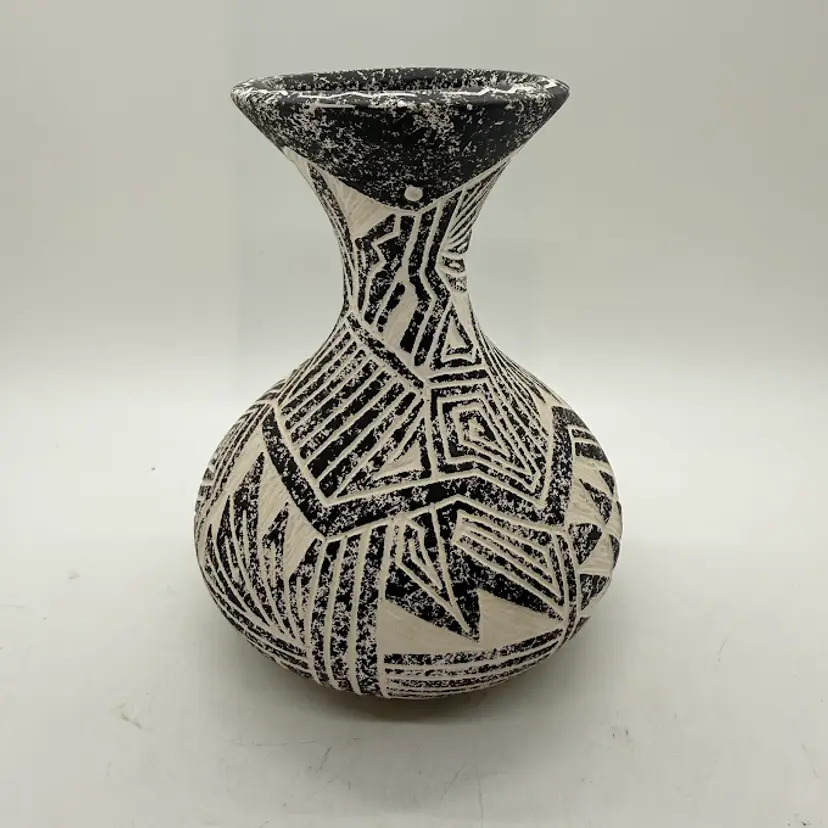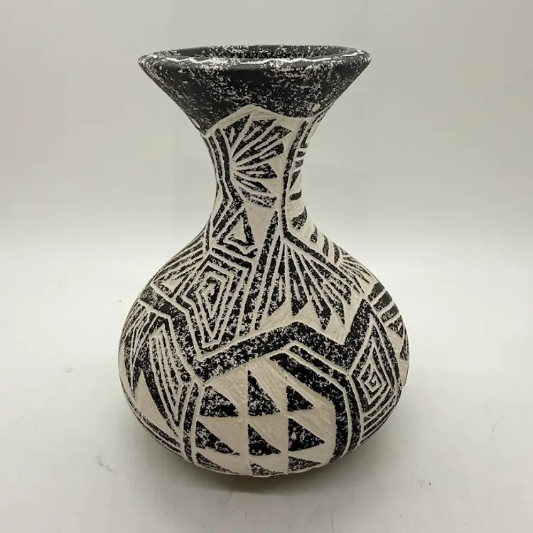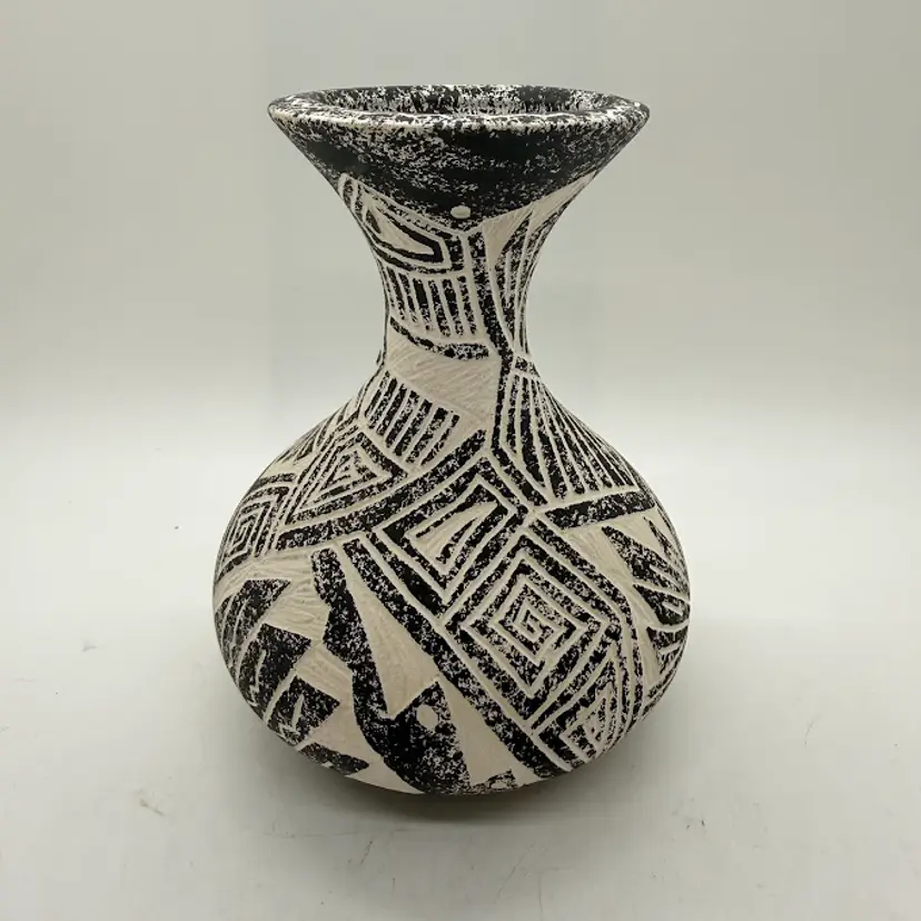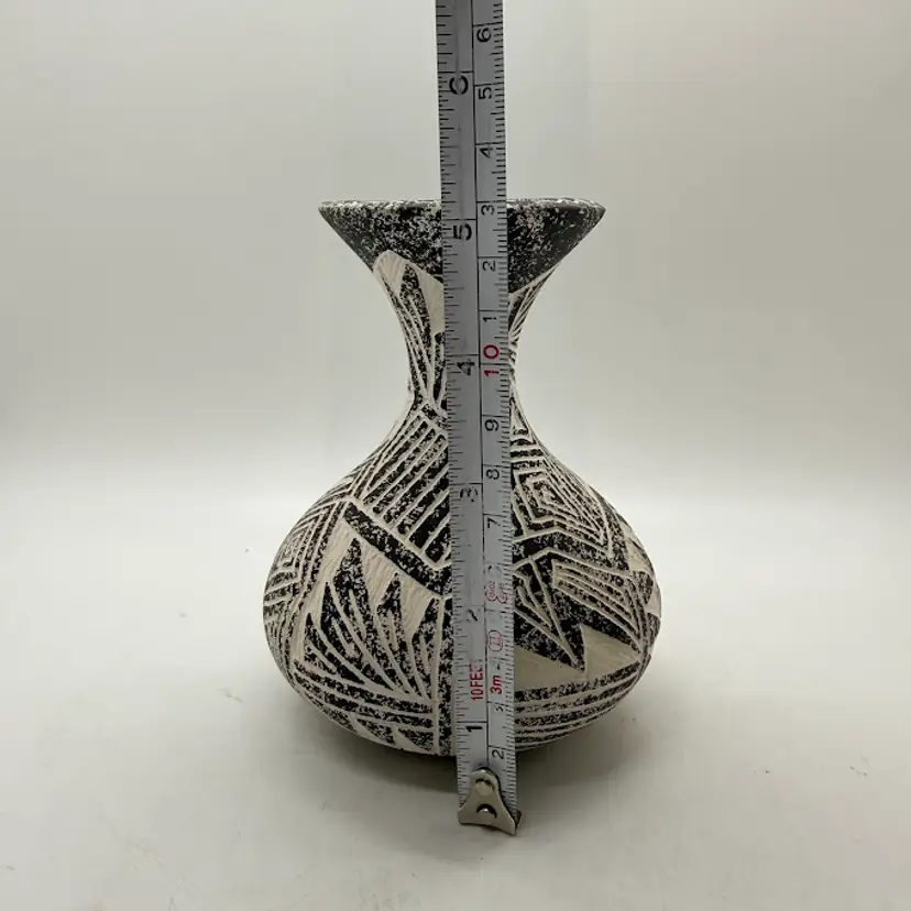 Acoma Pottery Vase 5" Black White Scraffito Signed David Routzen Pueblo Native. No chips or cracks. Signs of light wear and use; such as some scratching and scuffing. Please see pictures.
