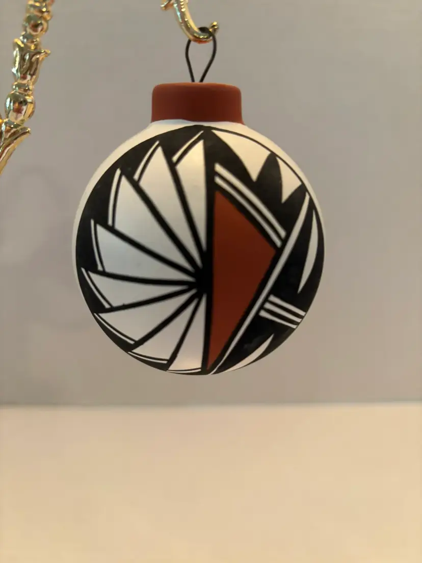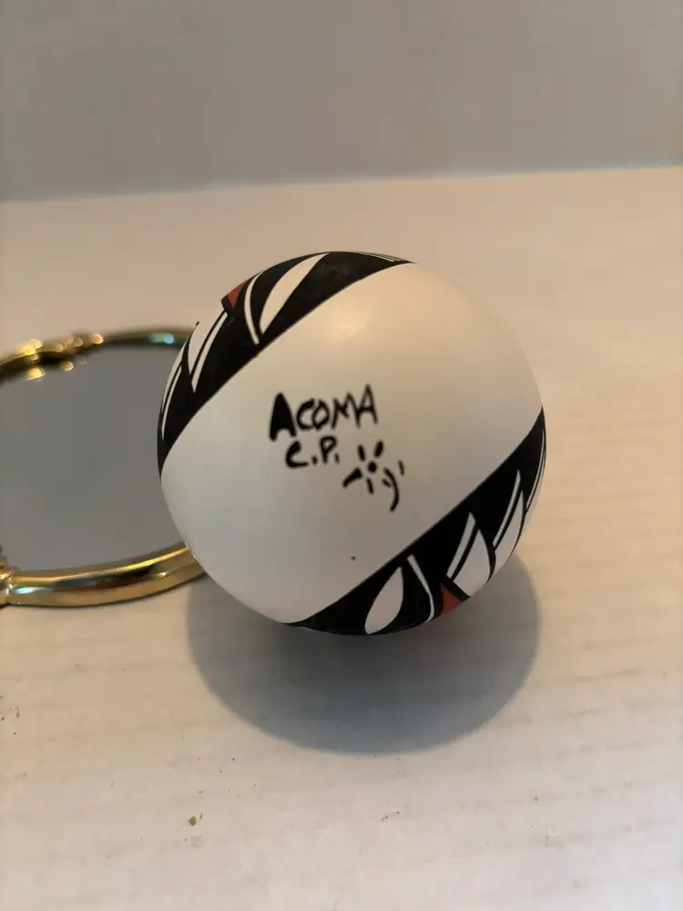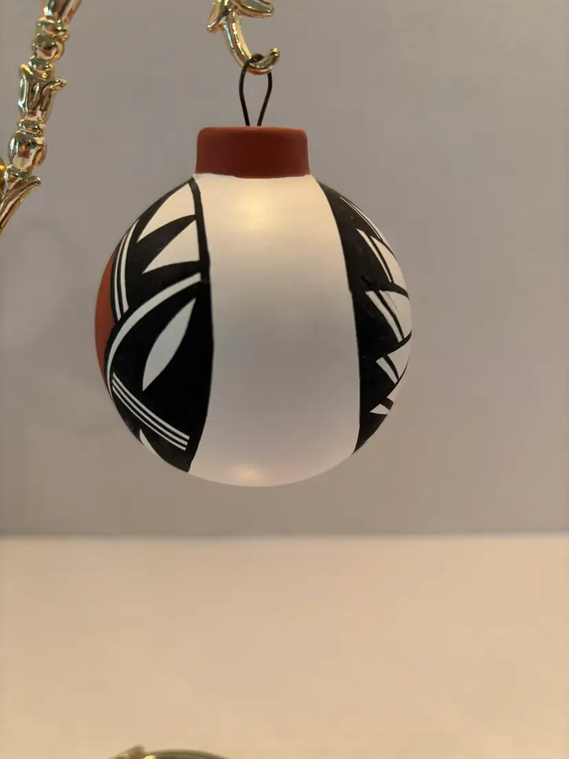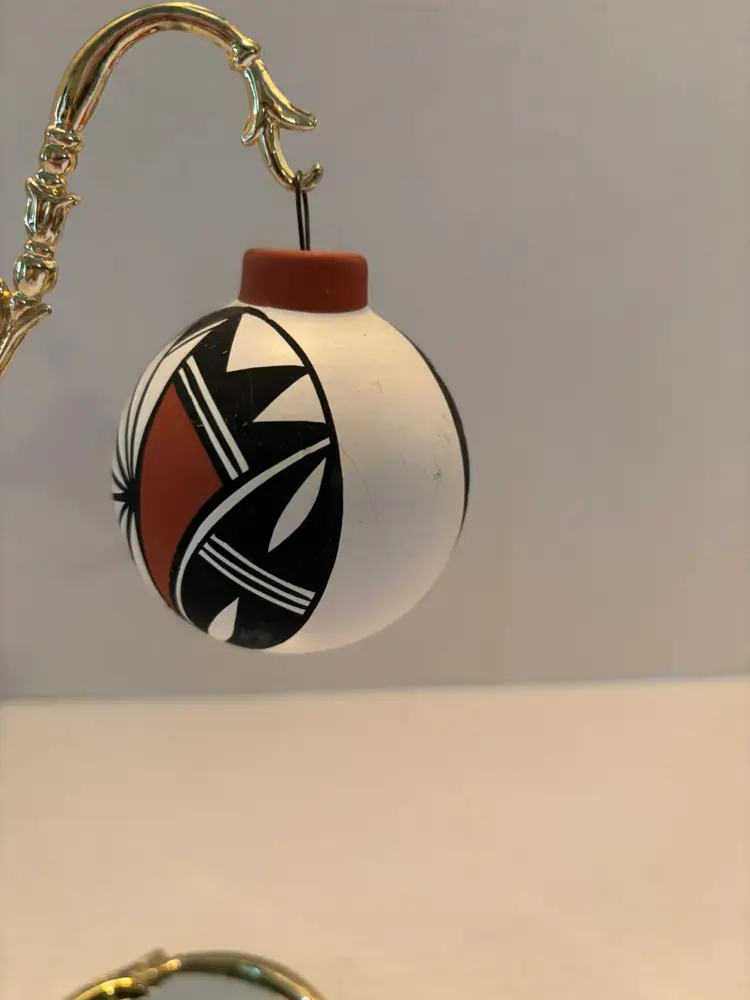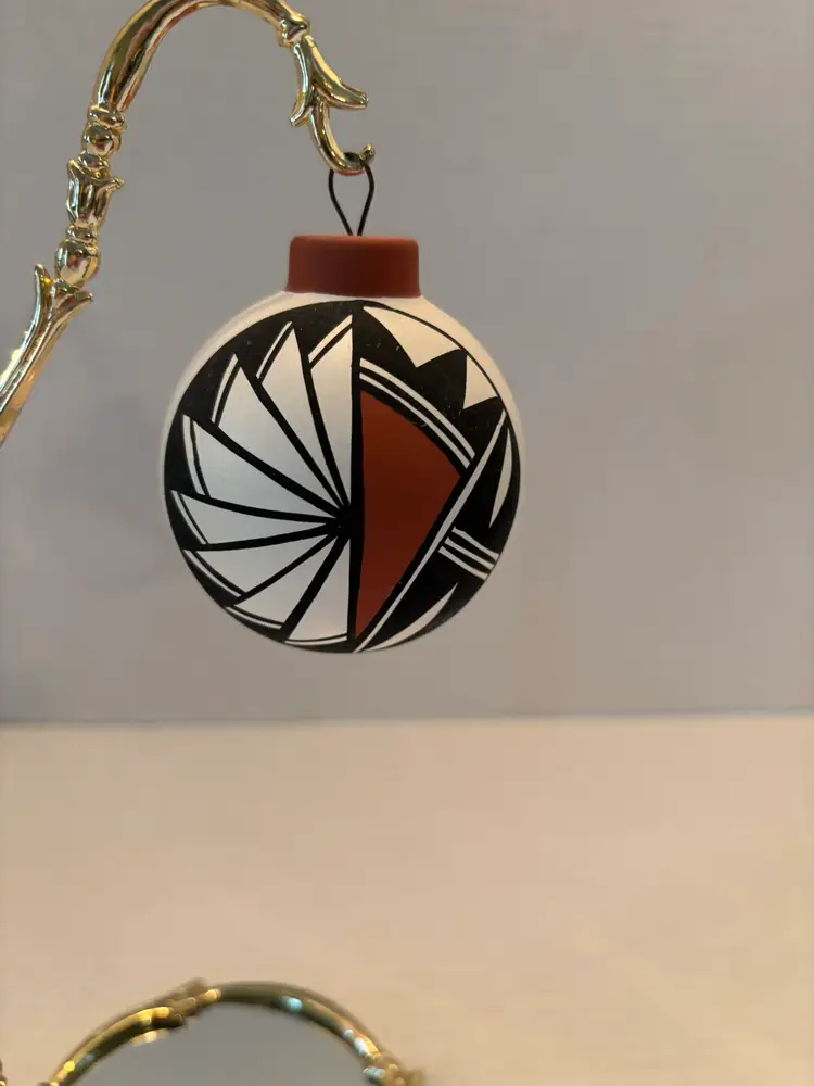 This Acoma Pueblo Ceramic Ornament with Stand is a handmade piece of Native American art, specifically from the Acoma tribe in the United States. The ornament features a white design with a black pattern, showcasing traditional Acoma Pueblo craftsmanship. The stand adds an extra unique touch to this collectible piece, making it a special addition to any home or collection. This ornament represents the rich cultural heritage and artistry of Native American tribes in the United States.