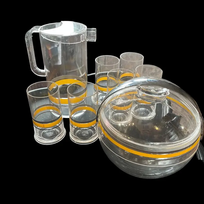 MCM Vintage 1970s Guzzini Acrylic Drinks Set by Paolo Tilche Yellow & Gray ice bucket, pitcher, 6 cups (one has a nic out of the bottom).