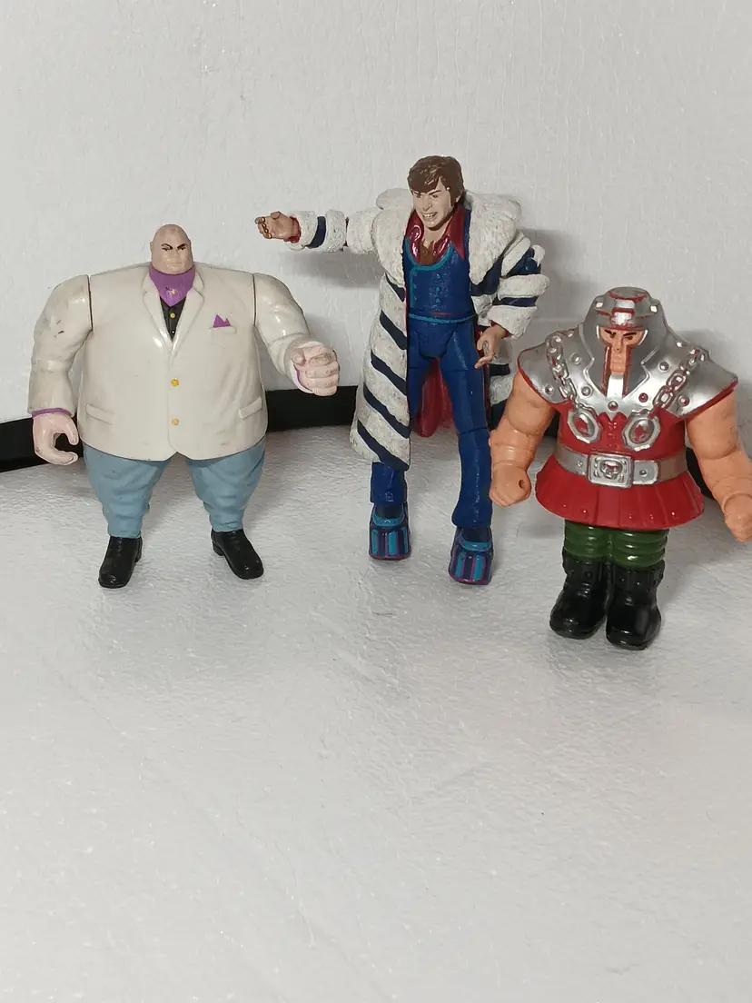This is an assortment of figures 3 one is a 90s villan the middle is austin powers in goldmemeber missing his cane hat and chain and a 1980s motu action figure