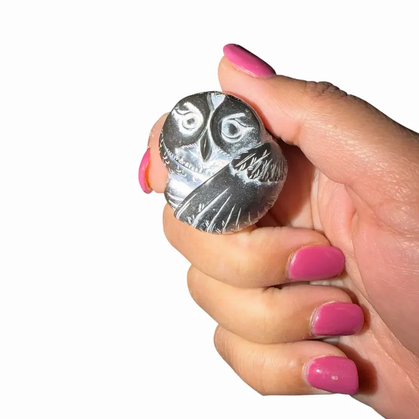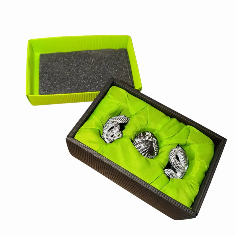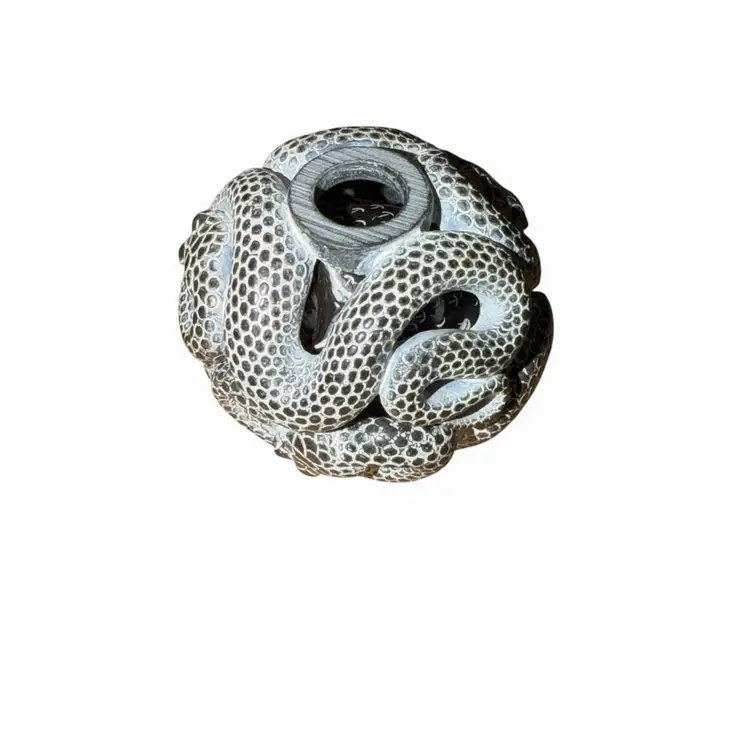 This miniature sculptural set features a beautifully detailed owl accompanied by two coordinating snake “cups.” The pieces can be displayed together as designed or separated for a more dramatic, sculptural presentation.
