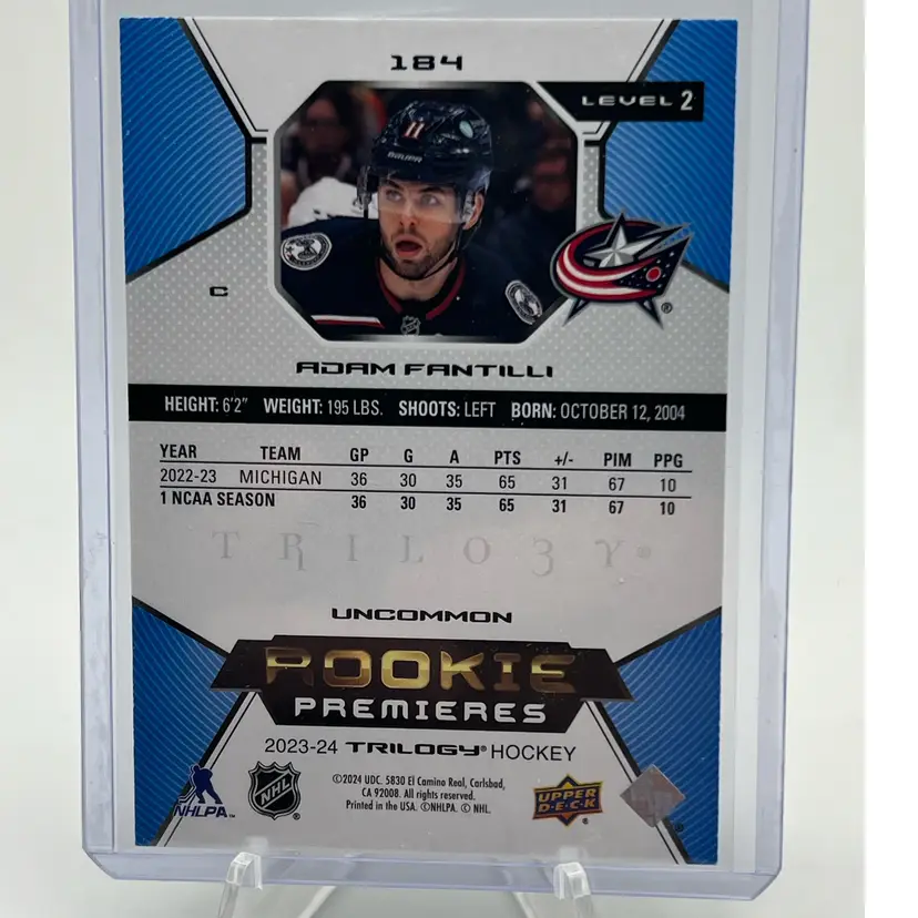 Adam Fantilli 2023-2024 Upper Deck Trilogy Level 2 Rookie Premieres 8/699 Columbus Blue Jackets. Shipping is $1.00 for the first card, +0.50 for additional cards, and ships PWE within 1-2 days.