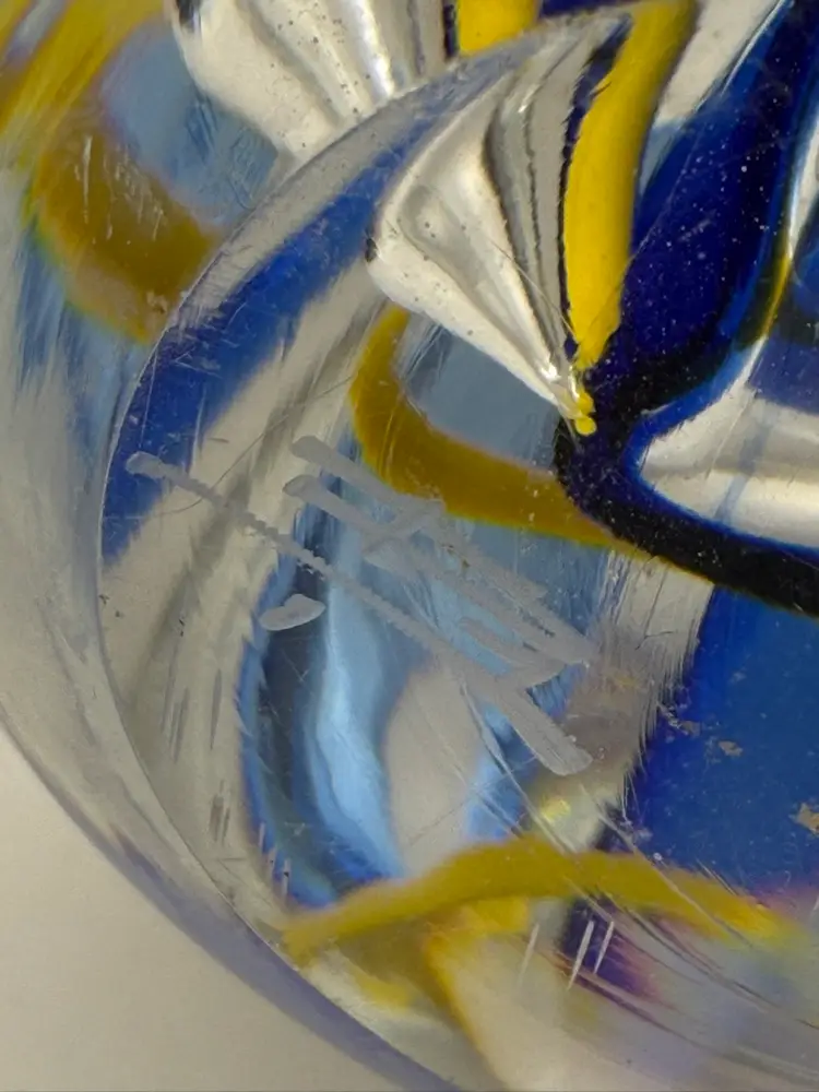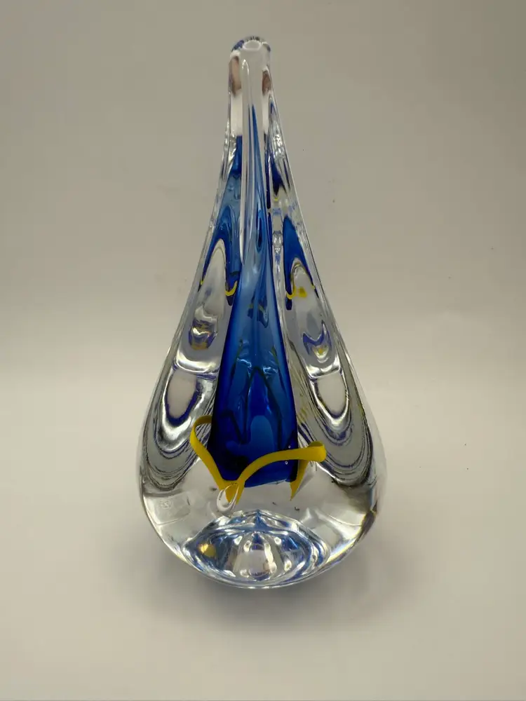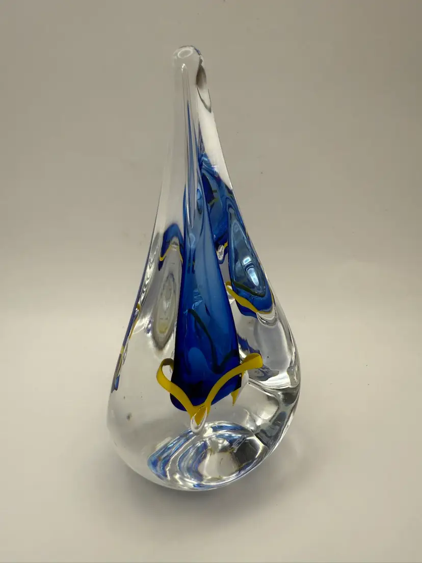 Three sided teardrop shape paperweight in beautiful condition with no chips or cracks Clear polished bottom Signed AH 5-1/2” tall