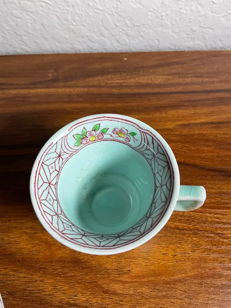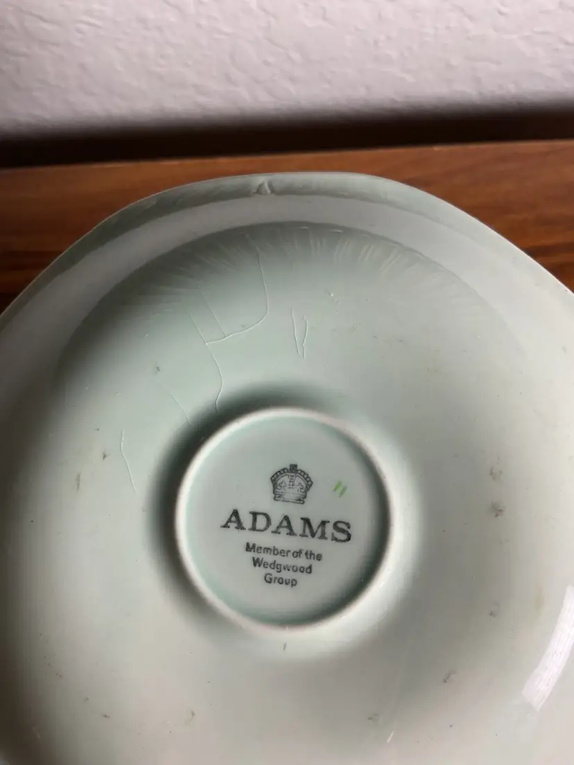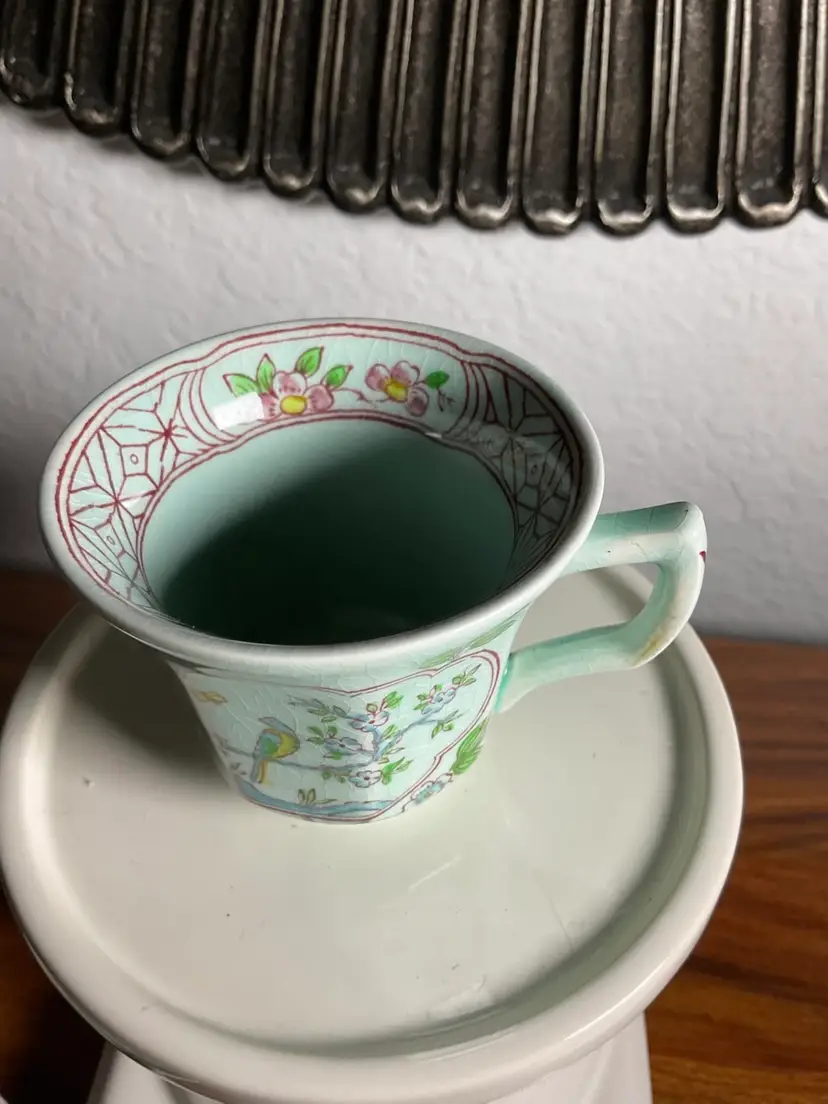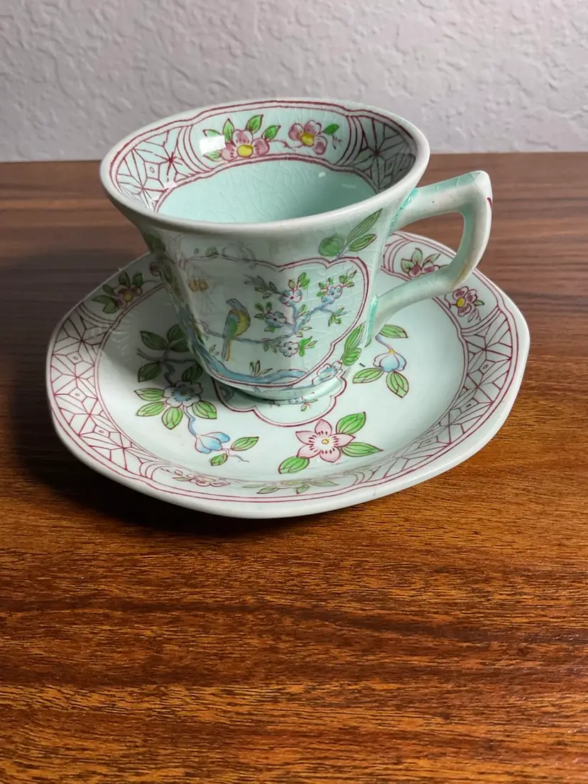 Teacup with saucer Made by Adams of England green with flower and bird pattern.