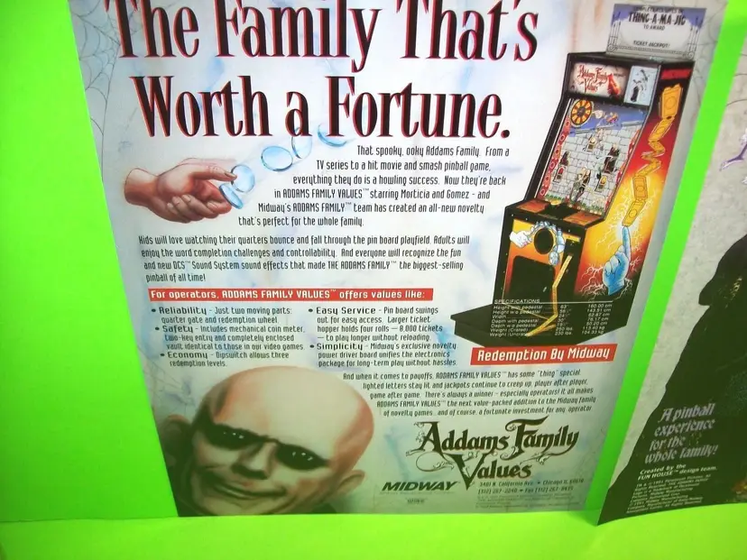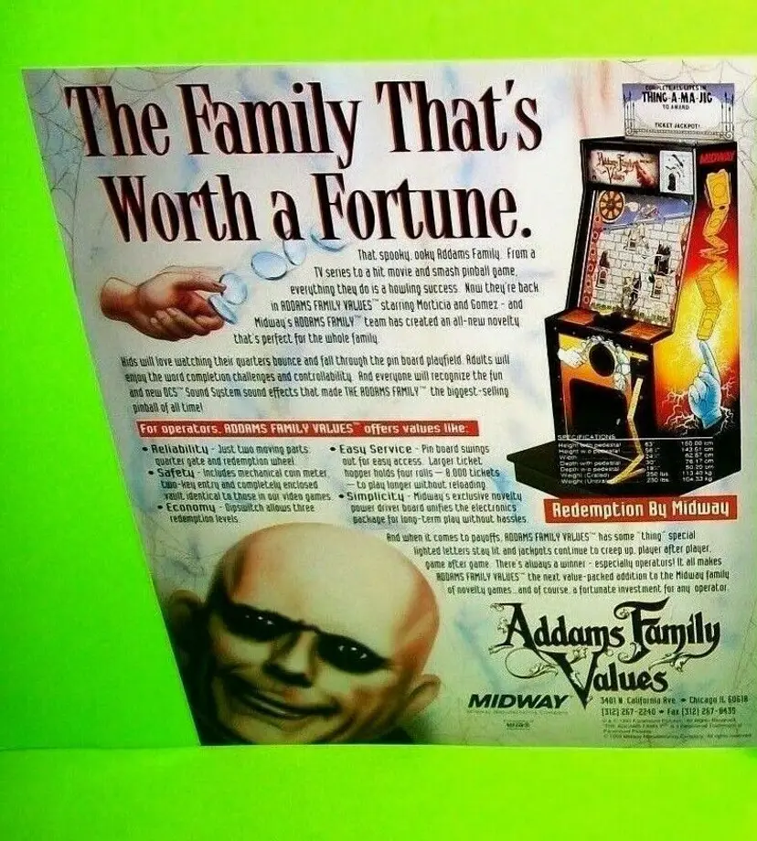 Arcade: Flyer Theme: Horror Modified Item: No Country/Region of Manufacture: United States Original/Reproduction: Original Year: 1993 Game Title: Addams Family Values Brand: Midway