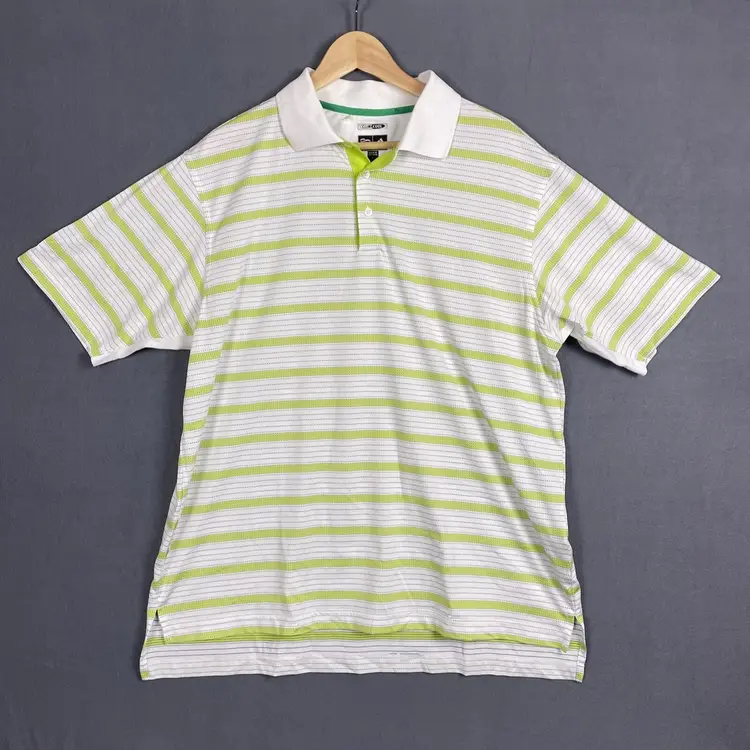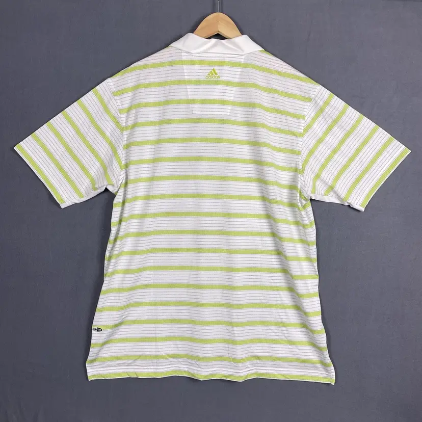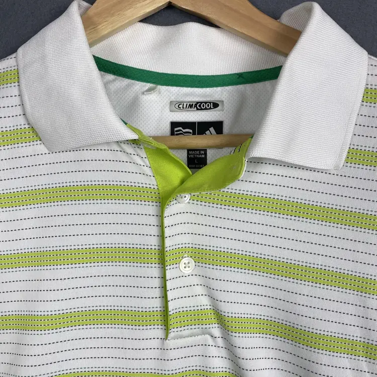 The Adidas ClimaCool Polo Shirt is a modern and performance-driven piece for men in size Large, featuring a solid green color with a collared neckline and short sleeves. Made of 100% Polyester microfiber fabric, it offers breathability and comfort suitable for various occasions such as travel, activewear, parties, casual outings, work, or business settings. This pullover shirt from the Adidas Climacool line is ideal for golf activities and designed with embroidered logo accents, in a regular fit for all-season wear.
