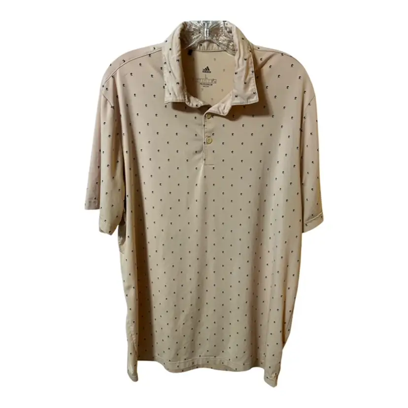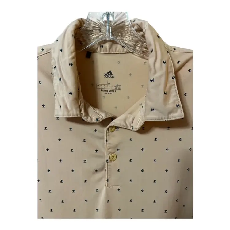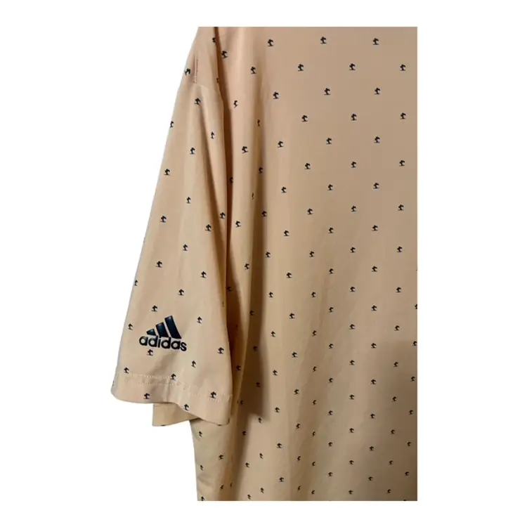 Upgrade your golf or casual wear with this Adidas men's large polo shirt in a stylish light peach color. Featuring a subtle pattern of dark blue palm trees, this shirt adds a touch of tropical flair. The three-button placket and classic folded collar enhance its clean, polished look.