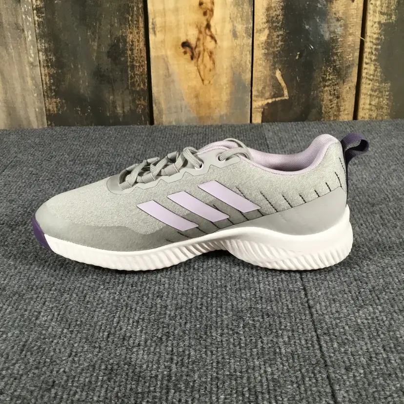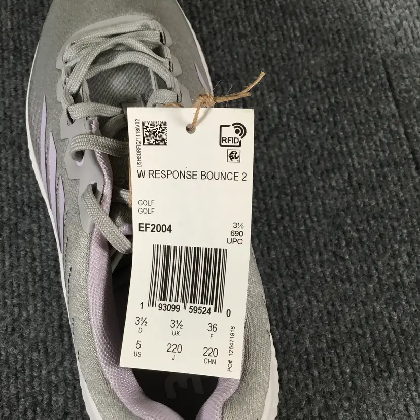Adidas Response Bounce 2 golf shoes Women’s size 5 Brand new with tags, no box Light grey uppers with lavender stripes and accents, dark purple rubber spikeless outsoles