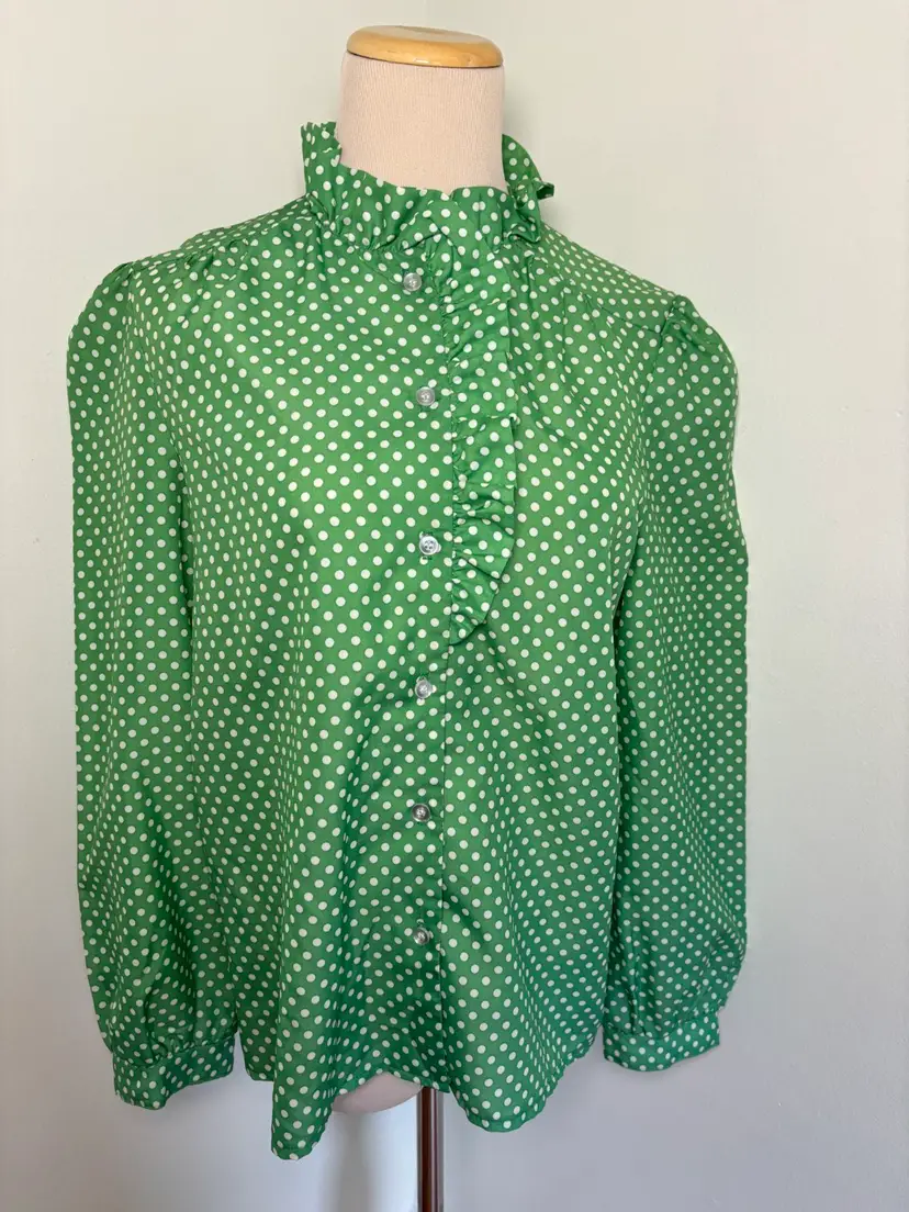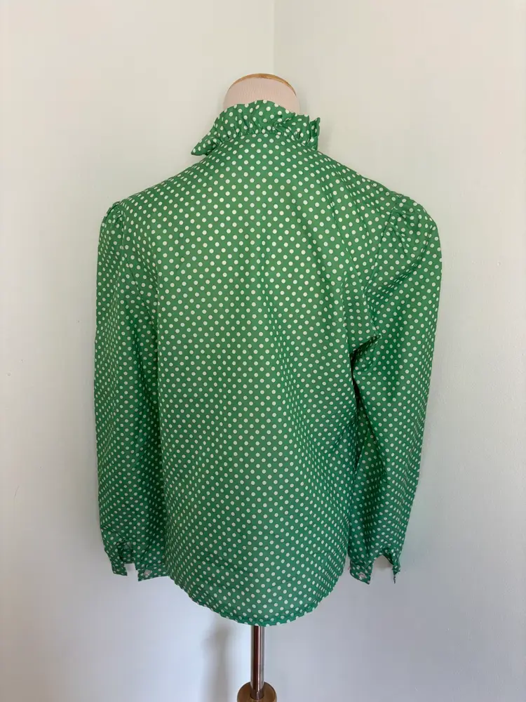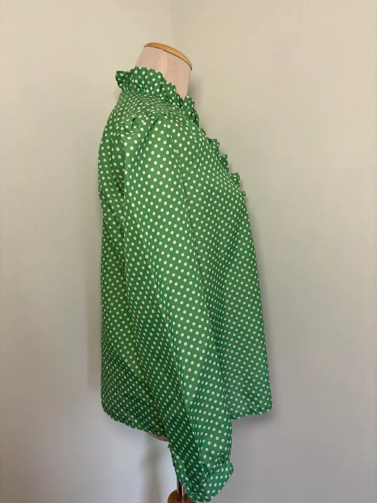 Adorable 1970s green polka dot blouse with ruffle collar Good vintage condition