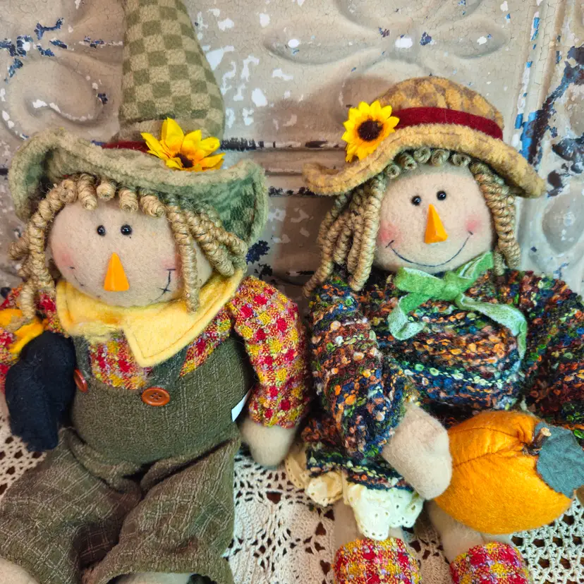 This adorable pair of a girl and boy scarecrow is in excellent, used condition, with no flaws. Measurements are depicted in the pictures of the item or listed in the details of the item. Please review the photos, as they are part of the item description. Photos will always reveal noticeable defects, as will my description. Any white “blemishes” that are not pointed out in this section are from the lighting that I use for my photos. If you need clarification, please reach out to me.