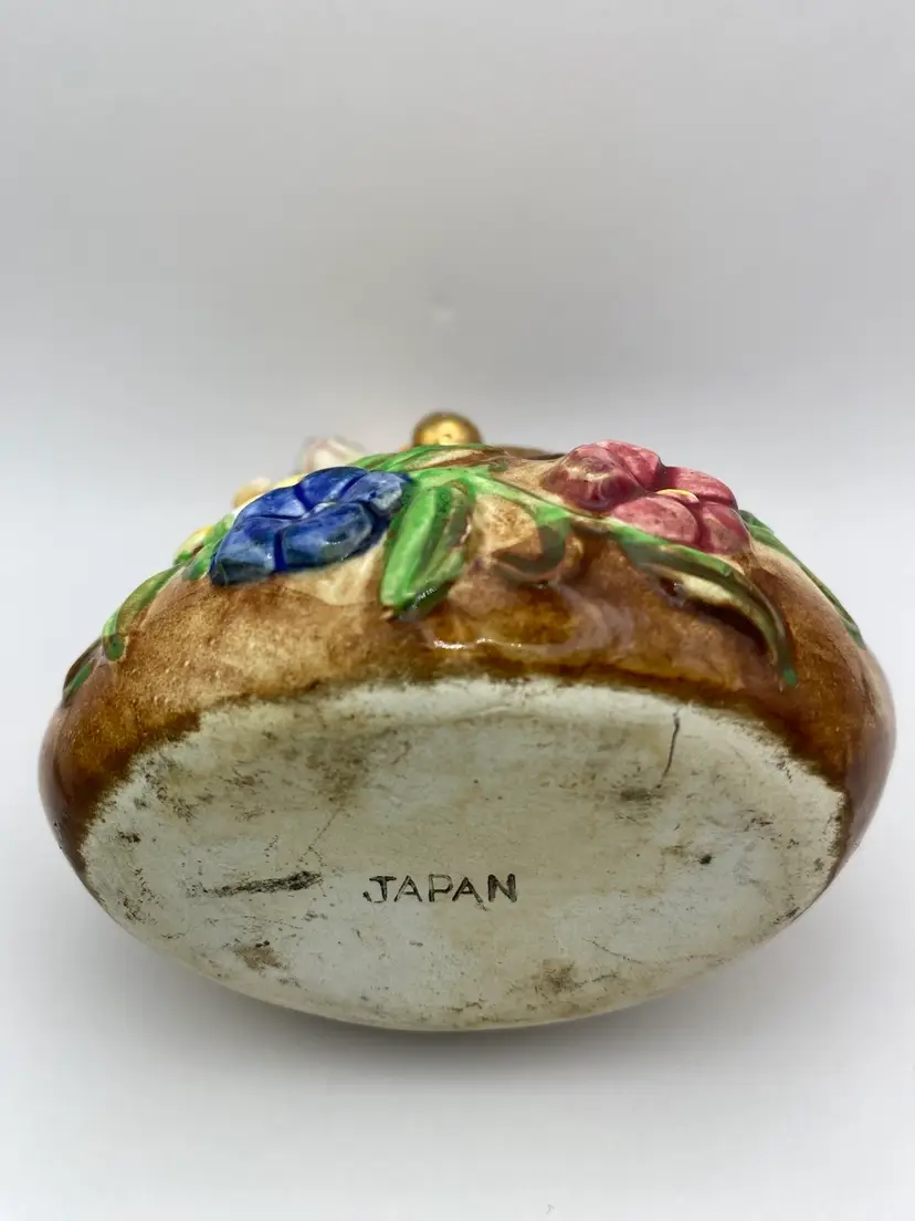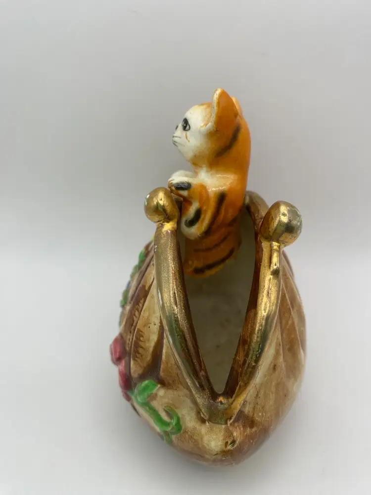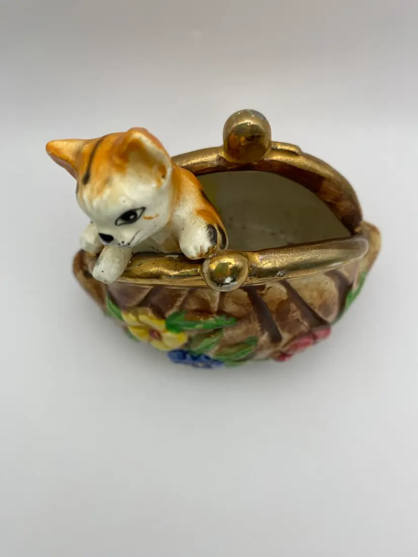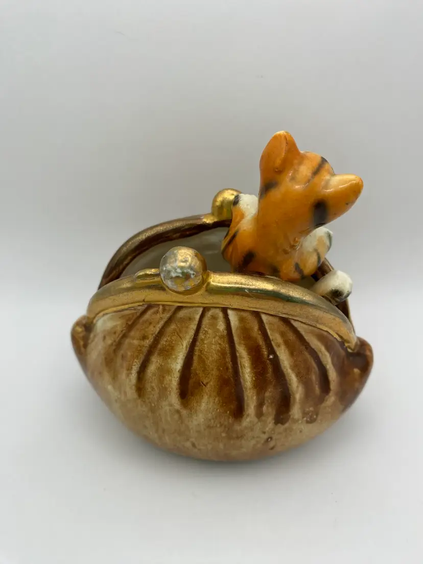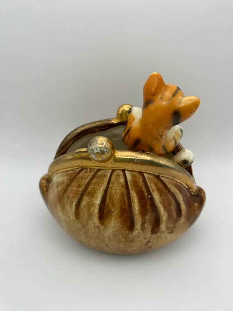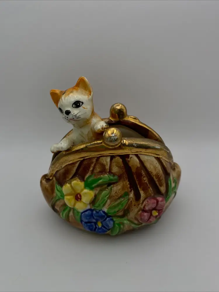 Adorable Porcelain Cat In Floral Bag. 3.5” x 3.25”. See pictures.
