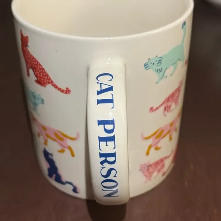 Mug is covered in cats in all colors and the handle declares “Cat Person”