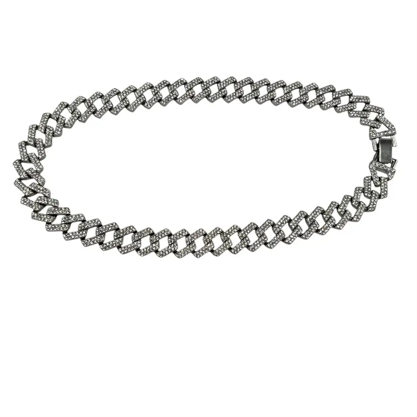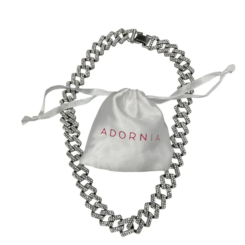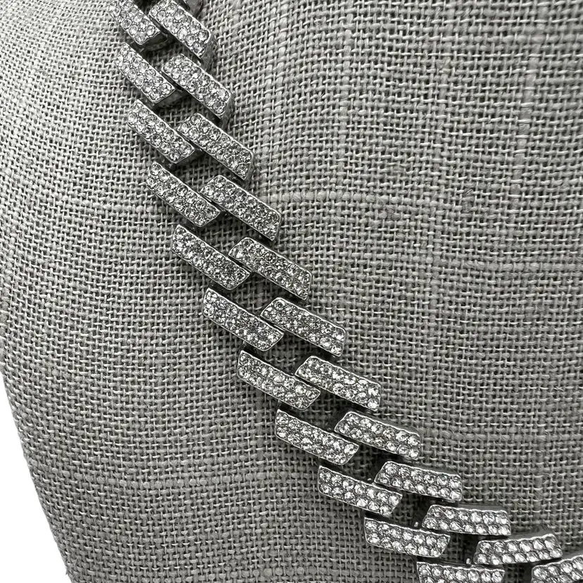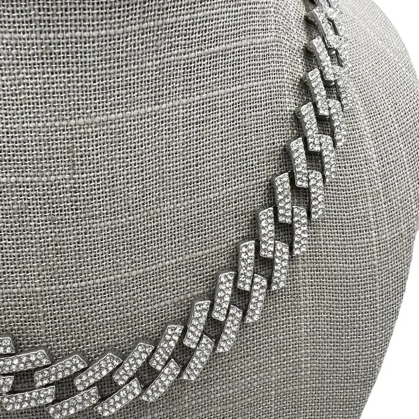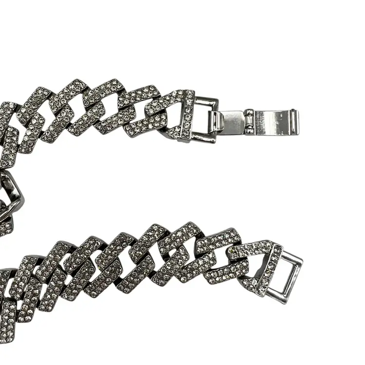 Adornia Silver Tone Edgy Crystal Chunky Cuban Chain Necklace. In good condition: light scratching to the clasp and one crystal rhinestone is missing near the clasp. Foldover clasp. Pavé Crystal rhinestones all over. Comes with a branded bag.